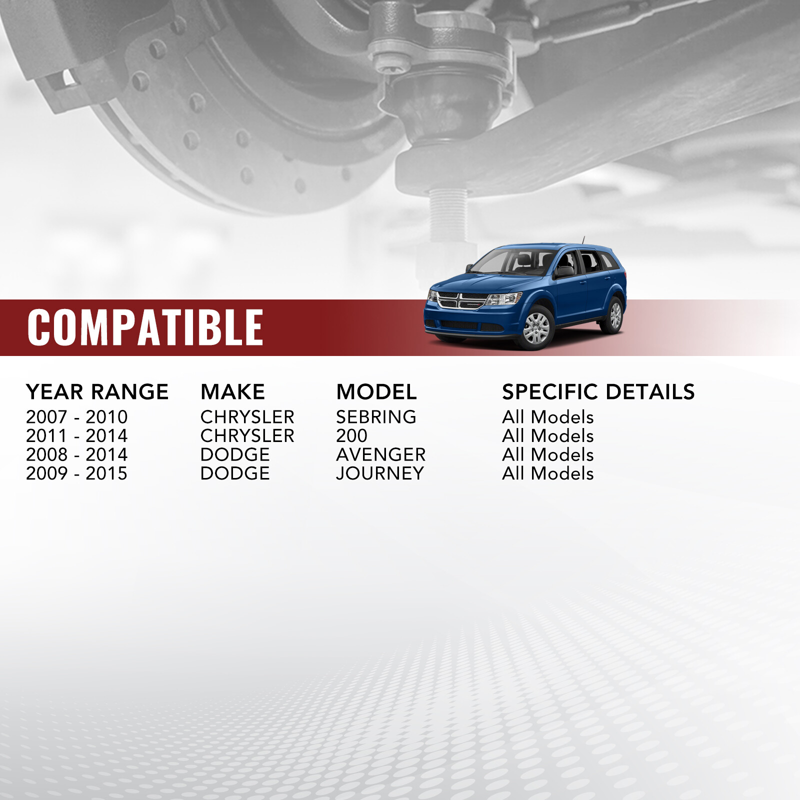Fitment: Fit for Chrysler Sebring 2007-2010 All Models Fit for Chrysler 200 2011-2014 All Models Fit for Dodge Avenger 2008-2014 All Models Fit for Dodge Journey 2009-2015 All Models Replacement OEM ( Original Equipment Part) Number: K500120,5085914AB,5085914AC,5085914AD,5090033AB,SR5745 Placement on Vehicle: Front, Left, Right Package Included: 2x Front Lower Ball Joint - K500120 Fitment: Fit for Chrysler Sebring 2007-2010 All Models Fit for Chrysler 200 2011-2014 All Models Fit for Dodge Avenger 2008-2014 All Models Fit for Dodge Journey 2009-2015 All Models Replacement OEM ( Original Equipment Part) Number: K500120,5085914AB,5085914AC,5085914AD,5090033AB,SR5745 Placement on Vehicle: Front, Left, Right Package Included: 2x Front Lower Ball Joint - K500120
