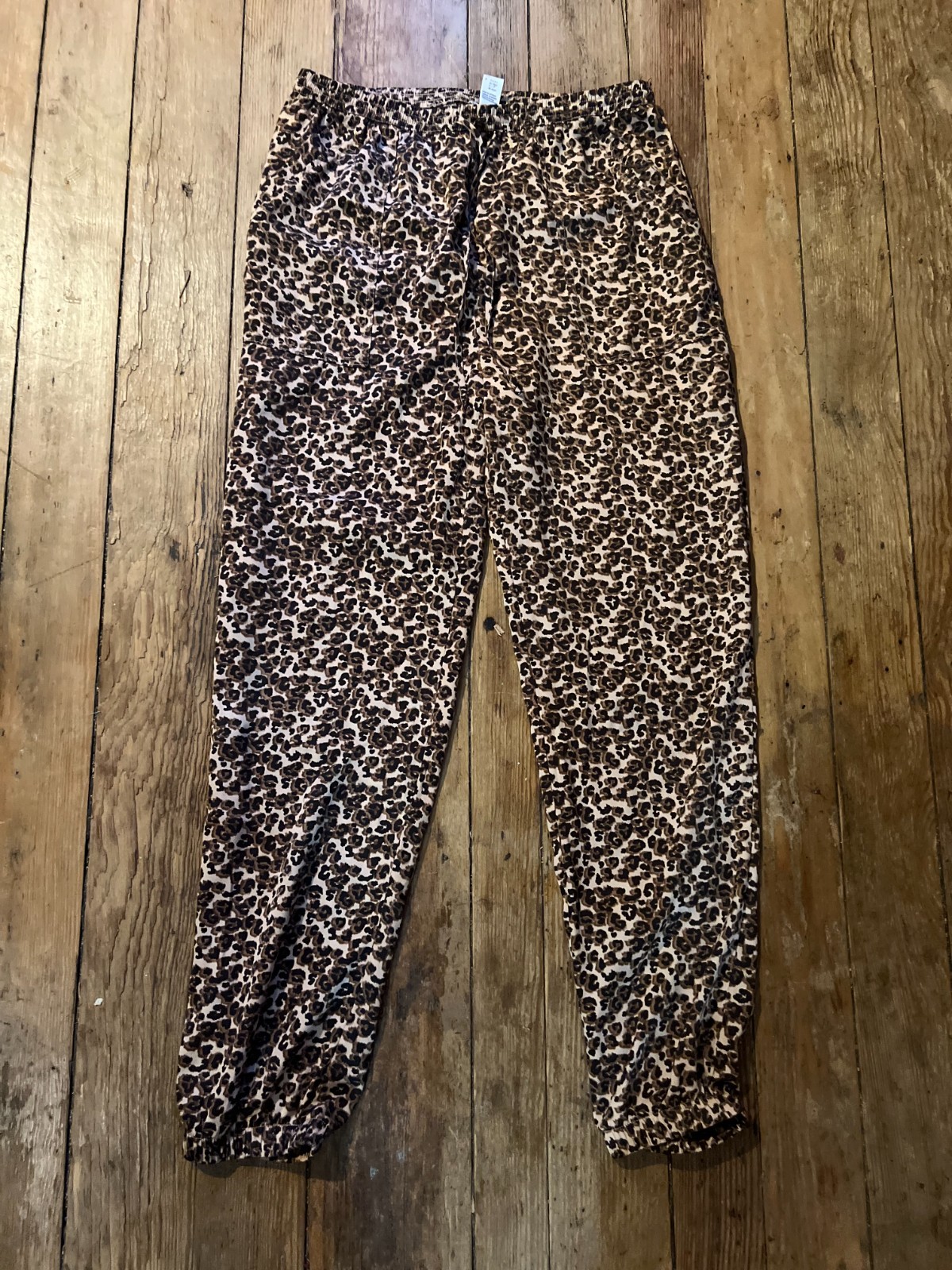 These Forever 21 Women's Leopard Print Pajama Pants in size Small are cozy and stylish lounge joggers perfect for lounging at home. Made from durable polyester material, these pajama pants feature a trendy animal print pattern in shades of multicolor, adding a fun and playful touch to your sleepwear collection. The babydoll style and leopard theme give these pants a fashionable edge, making them both comfortable and chic for a relaxing night's sleep.