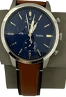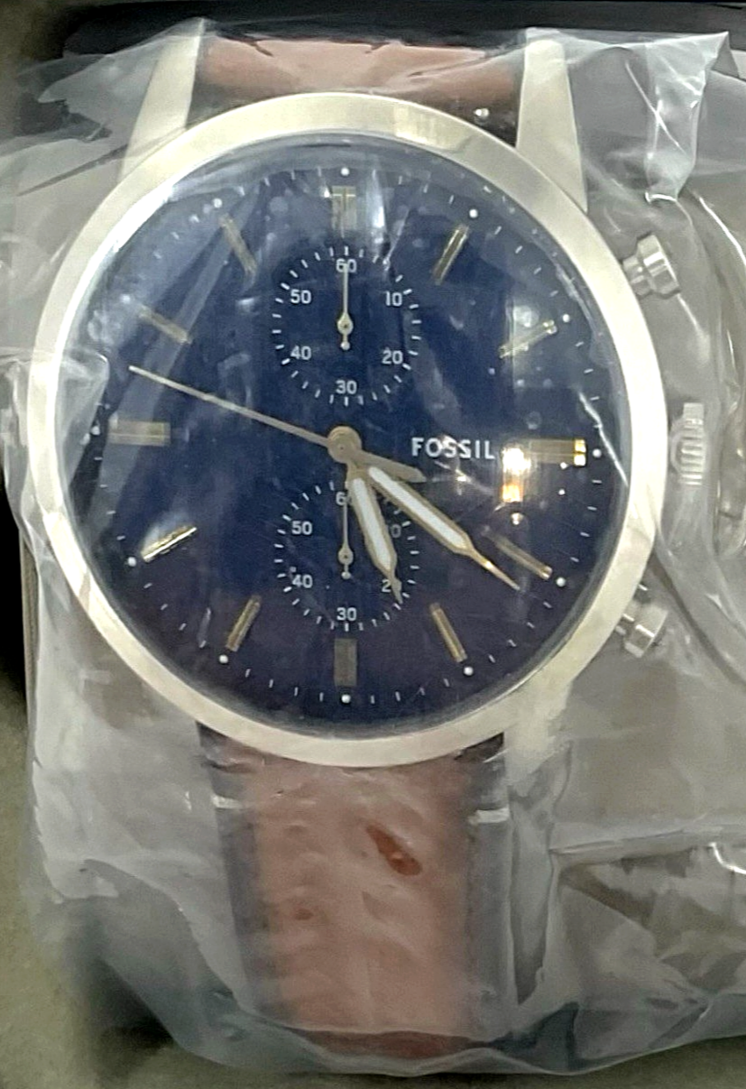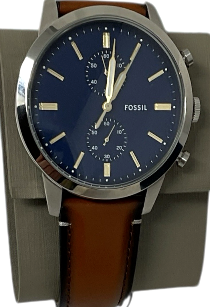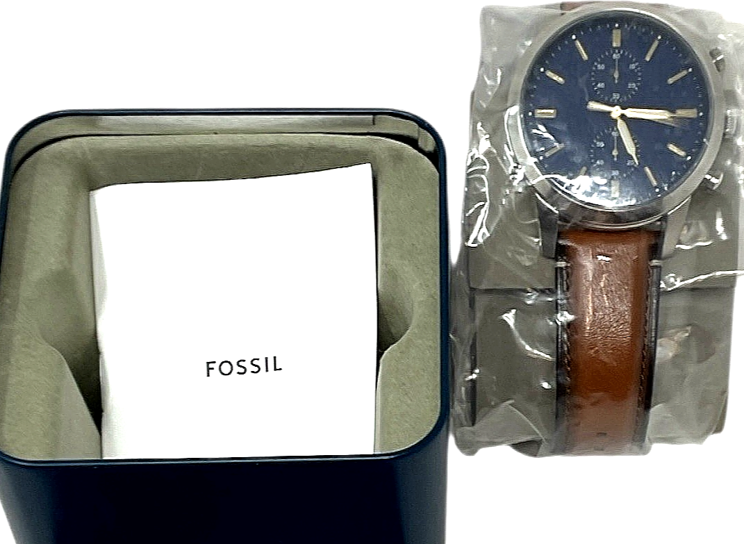 Fossil Men's Townsman 44mm Chronograph Luggage Leather Watch Brown/Navy FS5279 Features: Brown Luggage Leather Strap; Width 22mm Closure: Strap Buckle Case Size: 44mm; Stainless Steel; Silver Color Case Water Resistance: 5 ATM Crystal Type: Mineral Movement: Quartz Chronograph Navy Dial/Gold Accents Pre-Owned - * Surface scratches on case back & some damage to tin case. Tags still attached with manual/paperwork. Free Shipping USPS Ground Advantage.