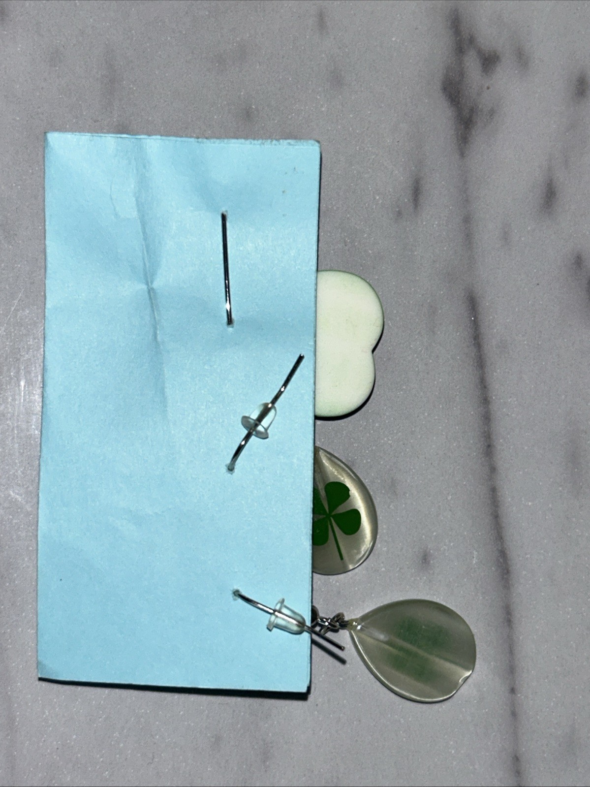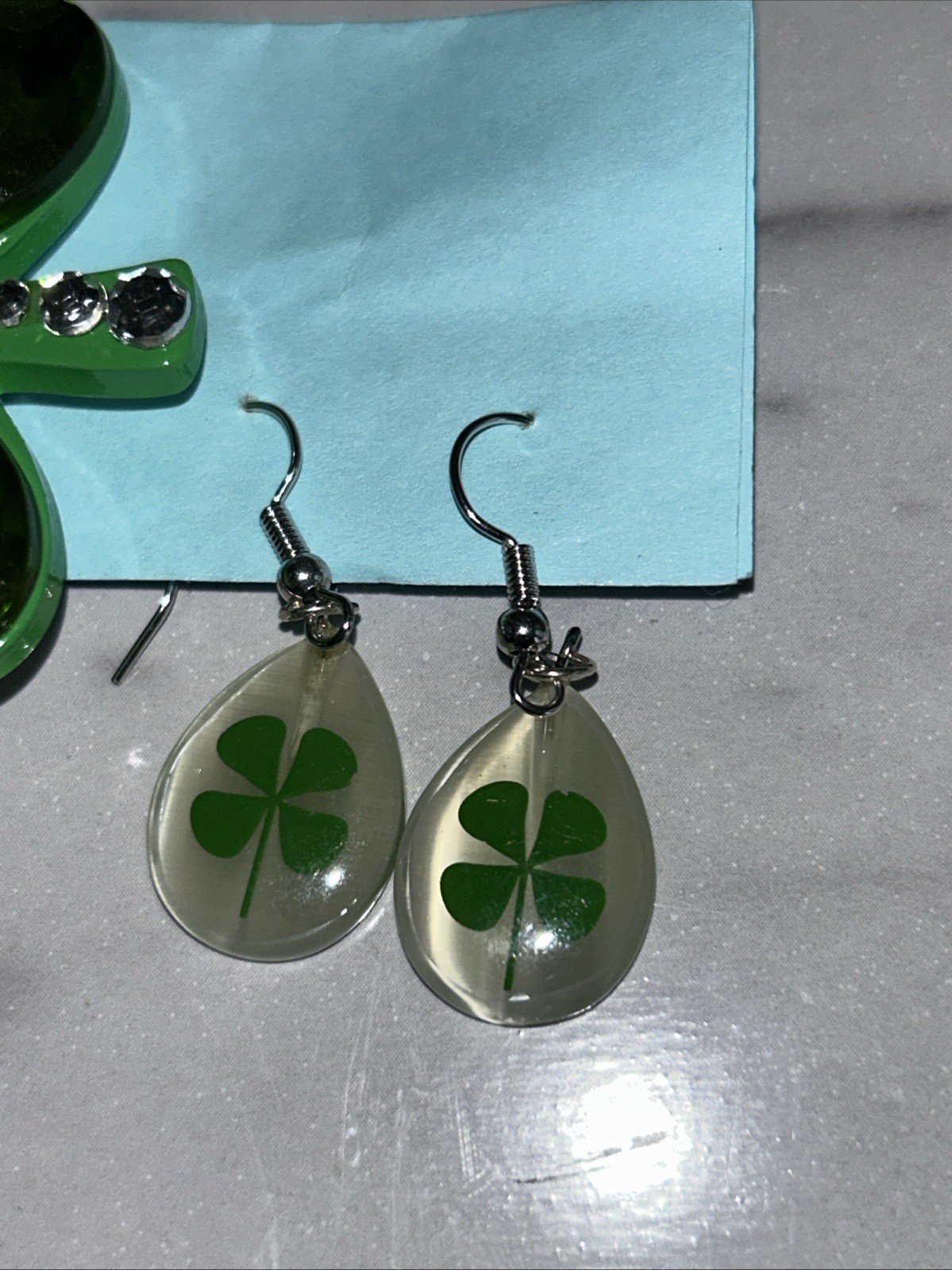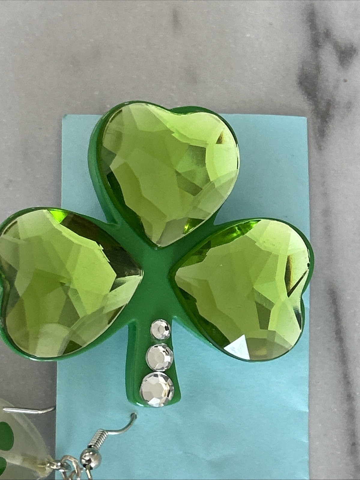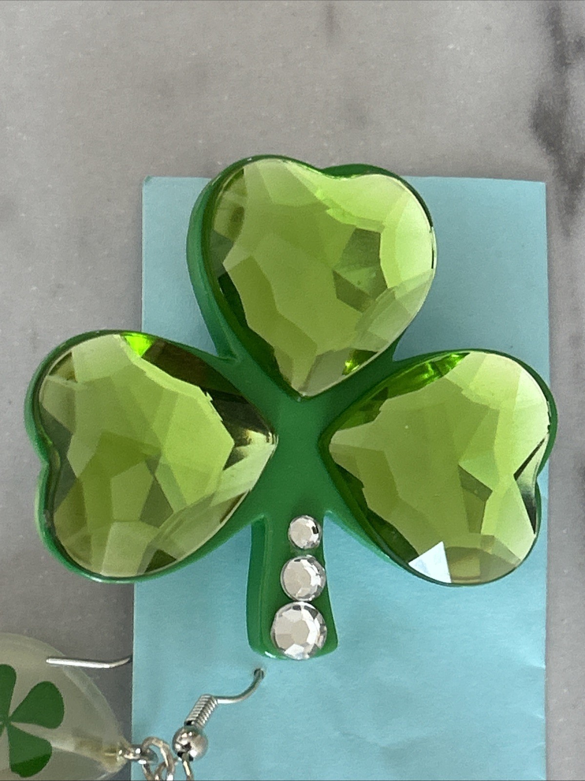 These Four-Leaf Clover Earrings and 3 Leaf 2” Pin are perfect accessories for celebrating St. Patrick's Day. Made with mixed materials and metals and in EXCELLENT CONDITION the dangle/drop style earrings feature a clover design that adds a touch of luck to any outfit. The set is a versatile and fun addition to your jewelry collection. Perfect for adding a festive touch on St. Patrick's Day or any time of year you want to spread some green luck.