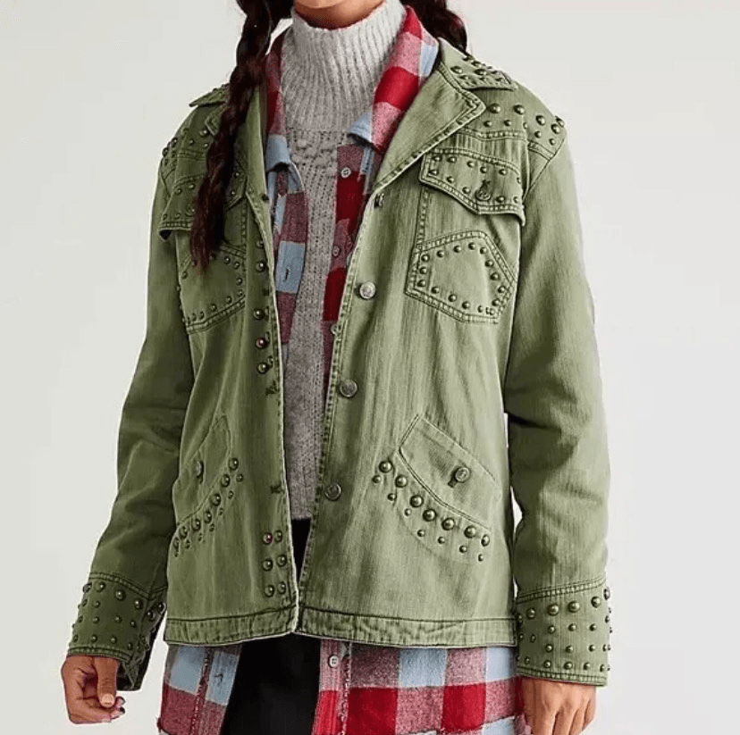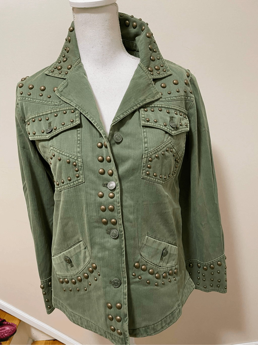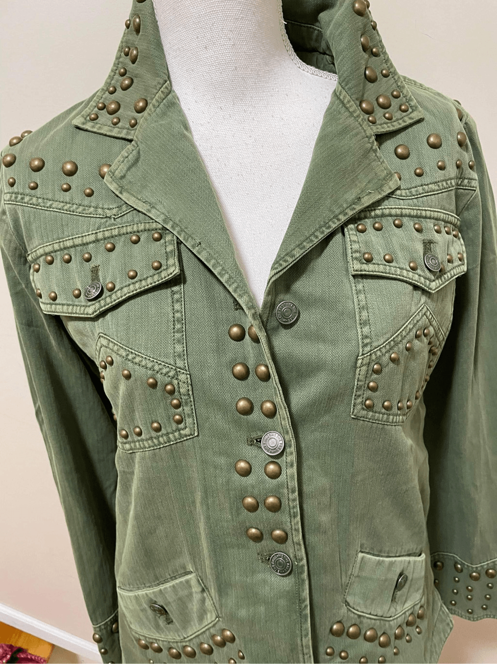Vintage-inspired Staple, Button-front silhouette Exaggerated stud detailing throughout for added dimension. Fit: Relaxed, classic fit Features: Classic collar, button-front closure, four-pocket style, defined seaming, rounded bottom hem Pit to pit: 55cm / 22" Length: 70cm / 28in Brand new items 100% Authentic Line through Name tags (Inside tag) only done to prevent store returns Dec 12 II