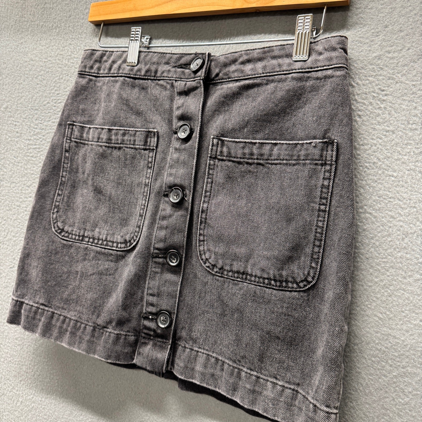 We the Free from Free People Skirt Womens 27 Super High Rise DON'T GET ME WRONG Faded Black Denim Button Up + Pockets Boho Mini Very good condition, see all pictures for views. Color is a faded black or dark gray. •Waist: 28" •Length: 15" Thank you for your purchase, we appreciate you!