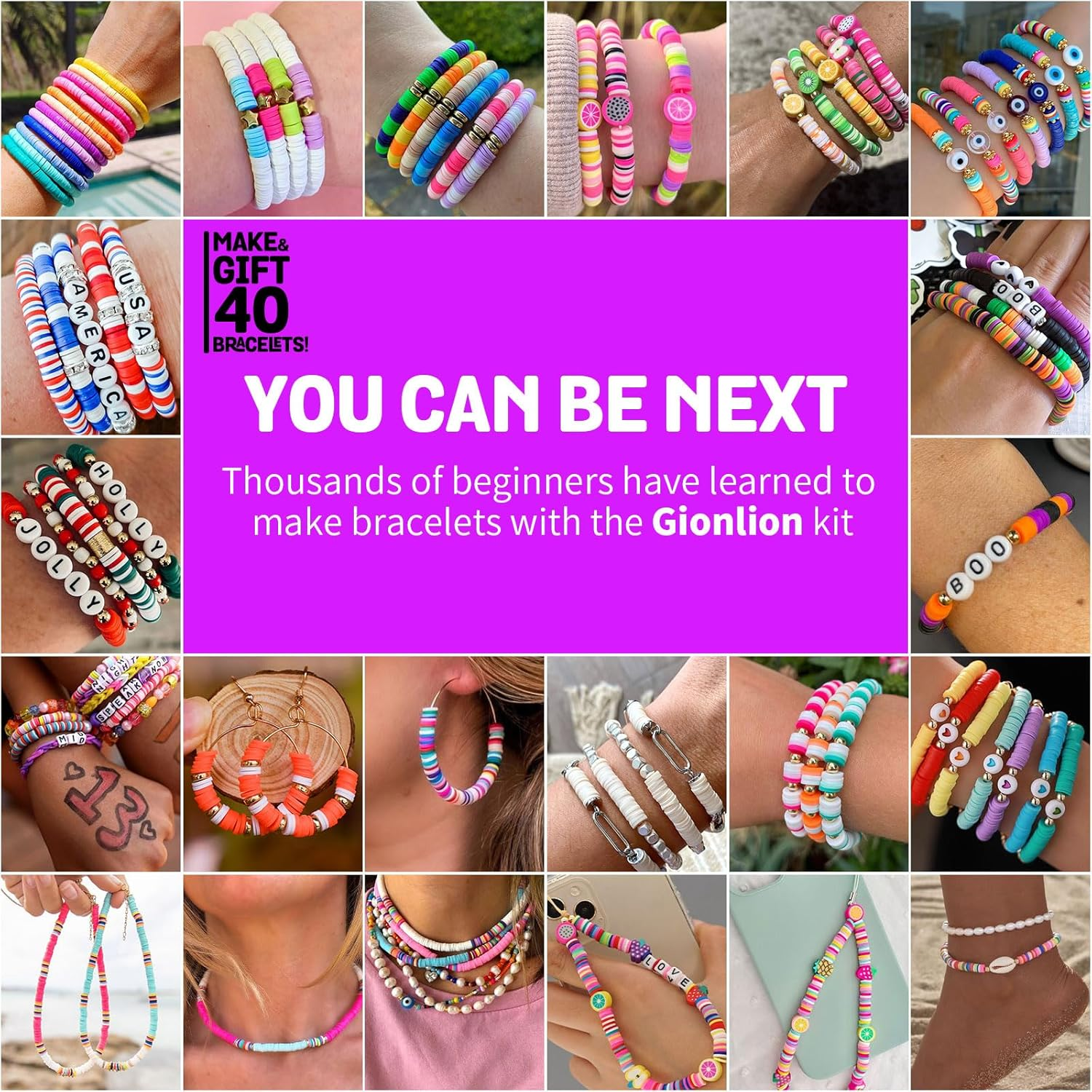 【All You Need Include】The clay beads kit includes 4740 pcs flat polymer clay beads, 460 pcs charms kit( contains A-Z letter beads, number beads,colorful heart beads,evil eye beads,shells, pendants, jump rings, lobster clasp, etc.) and beading tools (1 roll of 10 meters elastic strings,a scissor and a tweezer) . We prepare all you need for bracelet or jewelry making. 【Beginner Friendly Beads Kit】We've prepared instructions and videos tutorials to teach you step by step from bead stringing, tie knots to make bracelets, earrings, jewelry and more friendship bracelet making ideas. Whether you are a beginner or experienced jewelry lover, we hope to give you a relaxed and pleasantly experience. 【Perfect Friendship Bracelet Making Kit】Singer Inspired Friendship Bracelet making kit for Gifts As The Music Fans Of Singer. Spelled-out names, words, lyrics, album titles or phrases on the friendship bracelets and take to the concert or movies together. 【Kids Friendly Materials】The beads are made of healthy and environmentally friendly materials, light and durable, comfortable to the wear, not easy to fade, waterproof, and can be worn when bathing or swimming.The clay beads for bracelet is 6mm in diameter, 2mm in hole and 1mm in thickness. Recommended for kids ages 6+. 【Not Only Bracelet Making Kit】With thousands of clay beads and variety of charms accessories, endless crafts possibility is waiting for you. The clay beads for bracelets kit is perfect for making bracelet,neckace,earrings,anklet,key chains,phone chains etc. so make the friendship bracelet, take the moment and taste it. 【Ideal Gift Choice】Clay beads bracelet making kit is a great gift to help unleash creativity and improve hand flexibity, it will be a meaningful and fun gift for kids, teen girls, friends and yourself on birthdays, Valentine's Day, Mother's Day, Christmas, Thanksgiving, and more! Replacement or refund for any unsatisfied shopping experience. Product Description The video showcases the product in use. The video guides you through product setup. The video compares multiple products. The video shows the product being unpacked. videos tutorials Merchant Video 1 FRIENDSHIP BRACELET IDEAS 2 PREPPY BRACELET IDEAS 3 FESTIVAL BRACELET IDEAS 4 MORE JEWELRY KIT IDEAS