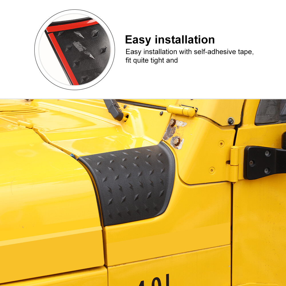 Front Cowl Body Armor Corner Molding Guard Trim for Jeep Wrangler TJ 1997-2006 | Black Front Cowl Body Armor Corner Molding Guard Trim for Jeep Wrangler TJ 1997-2006 Compatibility Compatible Models: For Jeep Wrangler TJ: 1997, 1998, 1999, 2000, 2001, 2002, 2003, 2004, 2005, 2006 Important: Specifically designed to protect the front cowl corners of your Jeep Wrangler TJ. Verify compatibility with your vehicle's body design before purchasing. Key Features Durable Protection: Made from high-quality ABS plastic with a rugged black finish for maximum durability. Off-Road Ready: Shields front cowl corners from rocks, debris, and trail damage. Sleek Design: Aggressive styling enhances the rugged appearance of your Jeep. Easy Installation: DIY-friendly with pre-applied automotive-grade adhesive tape. UV Resistant: Fade-resistant coating maintains appearance under prolonged sun exposure. Product Specifications Condition: 100% Brand New Material: High-Quality ABS Plastic Color: Gloss Black (as pictured) Fitment Type: Front Cowl Corner Guards Package Includes: 2x Corner Moldings (1 Set) Installation Instructions Clean the installation area thoroughly with rubbing alcohol to remove grease, wax, or dust. Test-fit the corner moldings to ensure proper alignment before removing the adhesive backing. If installing in cold weather, use a hairdryer or heat gun on low setting to warm the adhesive for better bonding. Peel off the protective backing of the adhesive, carefully position the guard, and press firmly for 1-2 minutes. Avoid washing your Jeep for 24 hours after installation to allow the adhesive to fully cure. Important Notes Specifically designed for Jeep Wrangler TJ 1997-2006 models. Confirm your vehicle's body style before ordering. Due to variations in lighting and screen settings, the black finish may appear slightly different from product images. Professional installation is recommended if you are unfamiliar with DIY modifications. No returns accepted for items showing signs of attempted installation. Ensure all surfaces are clean and dry before applying adhesive for optimal adhesion. Contact Us Jeep Wrangler TJ specialists available for: VIN-based compatibility verification Installation guidance and troubleshooting Customization options (matte black, textured finishes) Message us with your vehicle details for personalized support.
