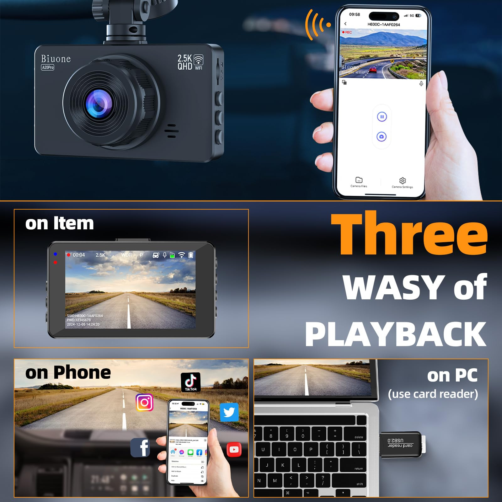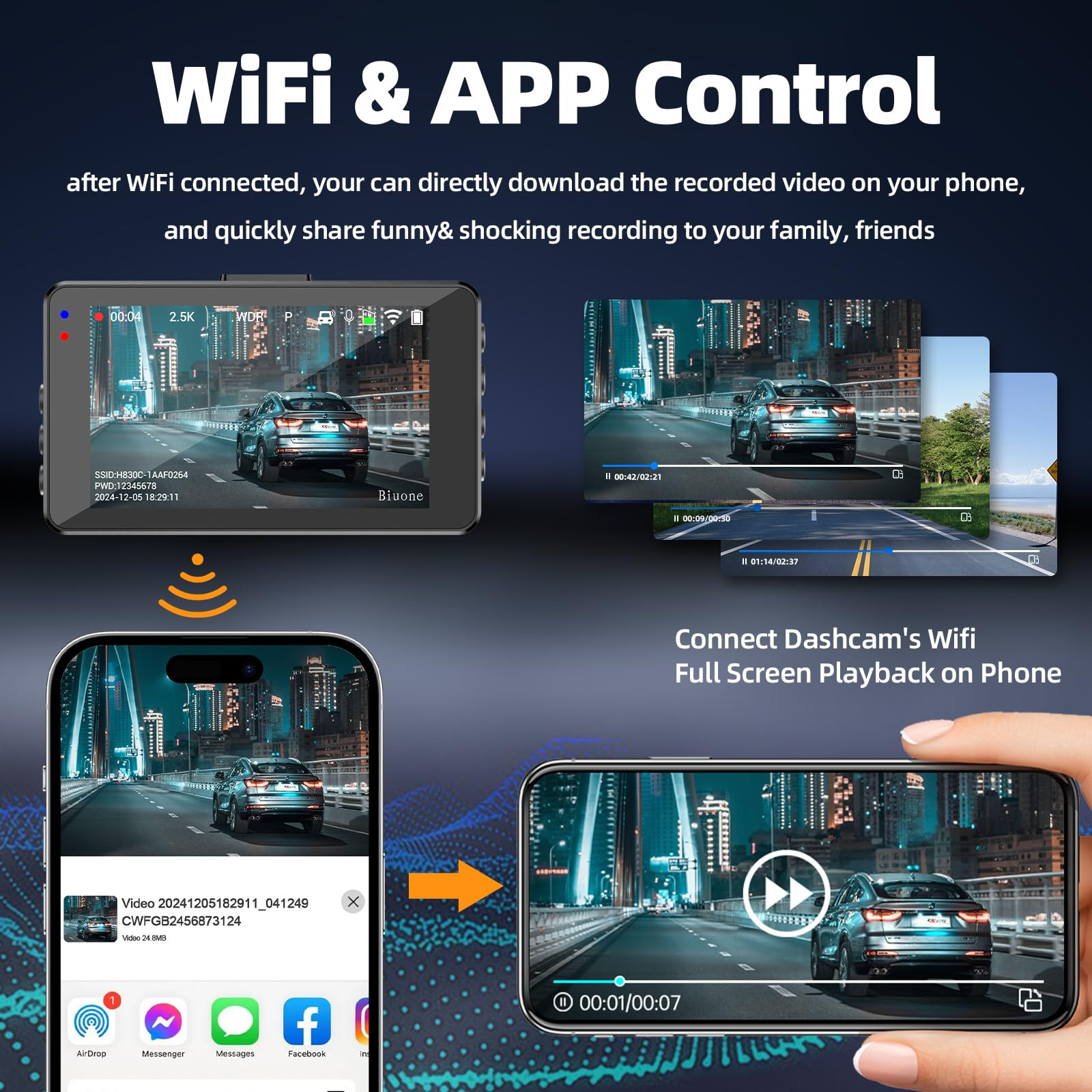 [Dashcam Front and Rear Camera] -- 2.5K and 1080P dual dash camera brings to you recording video of up to QHD 2.5K and FHD1080P resolutions). You can read the key details like road signs, license plates details etc. To reduce the blind areas it has the front wide angle of 170° and rear wide angle of 140°, monitor the front and back of your vehicle at the same time. Providing audio protecting you from potential accidents and liability issues [Dual Dash Cam Built-in WiFi & App Control] -- You can connect your iOS or Android devices with our dash camera. Conveniently setting menu and view, playback rocroding video of front and rear dash cam. Even one click share it to the social media platform, just enjoy the happy journey with all of your friends and family! Please note: Effective distance of 3-5 meters, car camera not support remote connection [Upgraded Vital Dash Cam] -- Dash cam front is equipped W/ high-resolution CMOS sensor and excellent 6-layer optical lens W/ F1.8 large aperture, HDR/WDR technology technology of camara para carro achieves super night vision by automatically balancing the exposure in extreme dark scenarios. Car camera - dash cam front and rear can clearly capture the road conditions in the night. This is another important part of front and rear car camera upgraded [Easy Setup Dash Cam ] -- This mini camera 3 inch IPS screen driving recorder takes up tiny space in your car, which won't obstruct your vision while driving. simple installation and set up, and equipped with 2 suction cup for replace. No worry about the installation even for a first time user. When you plug the dashcams power into car cigar lighter, the front dash camera will auto turn on and recording, dash cams perfect for trucks, vans, SUVs [Dashcams with 64GB Card] -- Because of seamless loop recording function, the newest recorded video will overwrite the oldest video when dash camera card is full(except the locked file), so it can always keep recording.If there are any problems (such as missing or damaged brackets, etc.), please con-tact me and I will arrange to send it out for you [1080P Rear Dash Cam] -- This is the A20 dash cam front and back upgraded type! According the feedback of our customer, we upgrade the 720P rear cam to 1080P. So that it can Better use with the front recorder, not only the 2.5k front recorder provides clearer video, but also the back dash cam [Dashcams for Cars] -- We pay much attention to customers' voice! We have our car camera dash cam team ,we have dash camera technology team. Maybe you can provide us a chance to test it