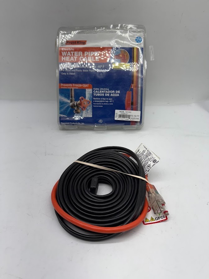 Frost King 18 ft Automatic Electric Heat Cable Kit | Freeze Protection for Pipes About This Item Protect your water pipes from freezing temperatures with the Frost King 18 ft. Automatic Electric Heat Cable Kit. Designed for both metal and plastic water pipes, this pre-assembled heating cable installs easily and activates automatically using its built-in thermostat when temperatures drop. Capable of helping keep water flowing in conditions as cold as minus 40°F, this reliable freeze-protection solution is ideal for homes, crawlspaces, basements, RV setups, and exposed plumbing in cold climates. The integrated power indicator light lets you know the system is operating at a glance. Key Features 18 ft. automatic electric heat cable for freeze prevention Designed for use on up to 2 in. metal and plastic water pipes Built-in thermostat automatically regulates heat output Helps keep water flowing in temperatures down to -40°F Plug includes a power indicator light for easy status monitoring Pre-assembled for quick and simple installation 120-Volt operation for standard household outlets Our Guarantee We take great care to inspect all items and ensure they are accurately described. Should you have any issues with your purchase, please let us know immediately. We are committed to resolving any concerns promptly and to your satisfaction. Our small business truly appreciates your patronage. frost king heat cable 18 ft automatic pipe heating kit freeze protection electric heat tape water pipe deicing thermostat controlled 120 volt basement crawl space winter pipe protection