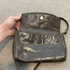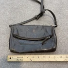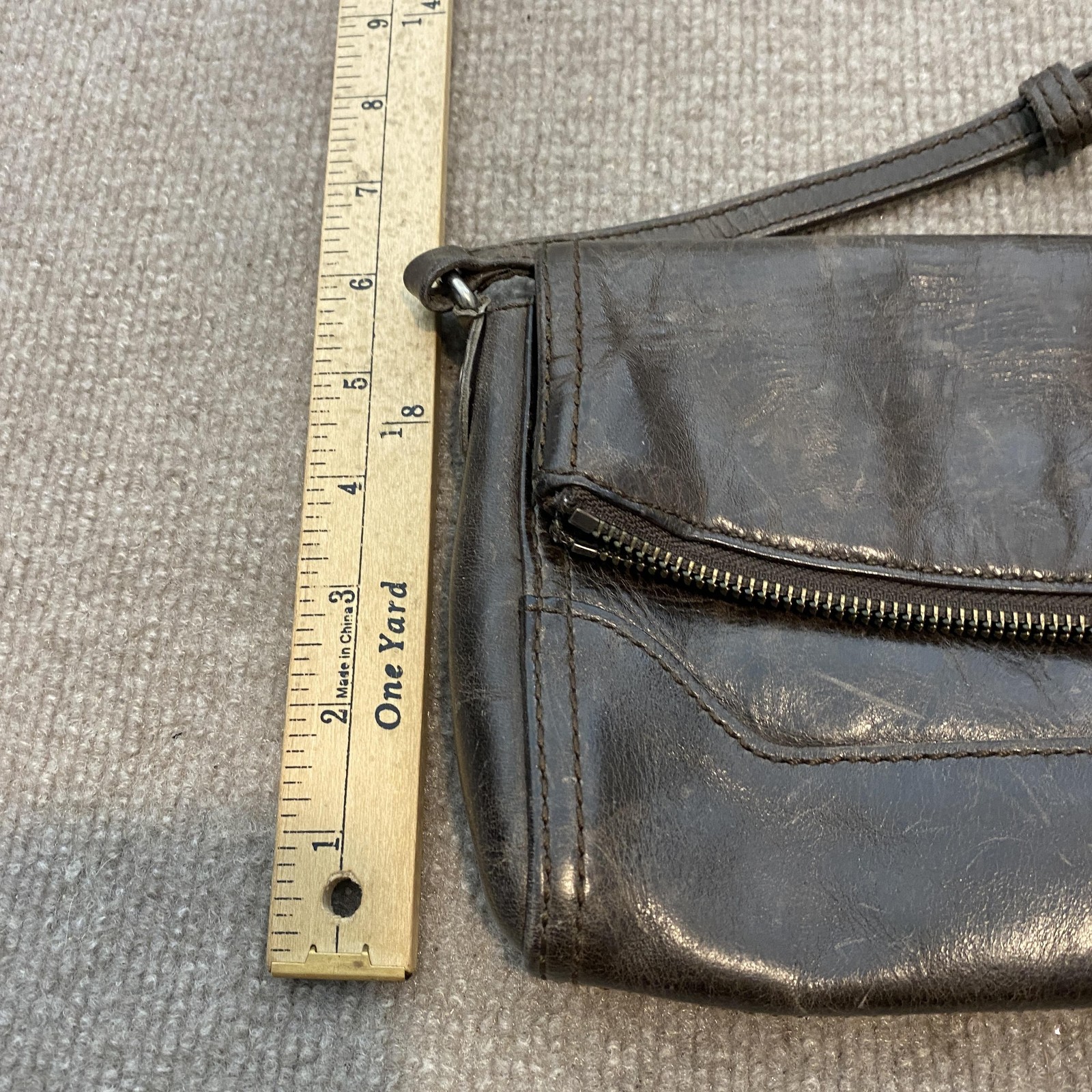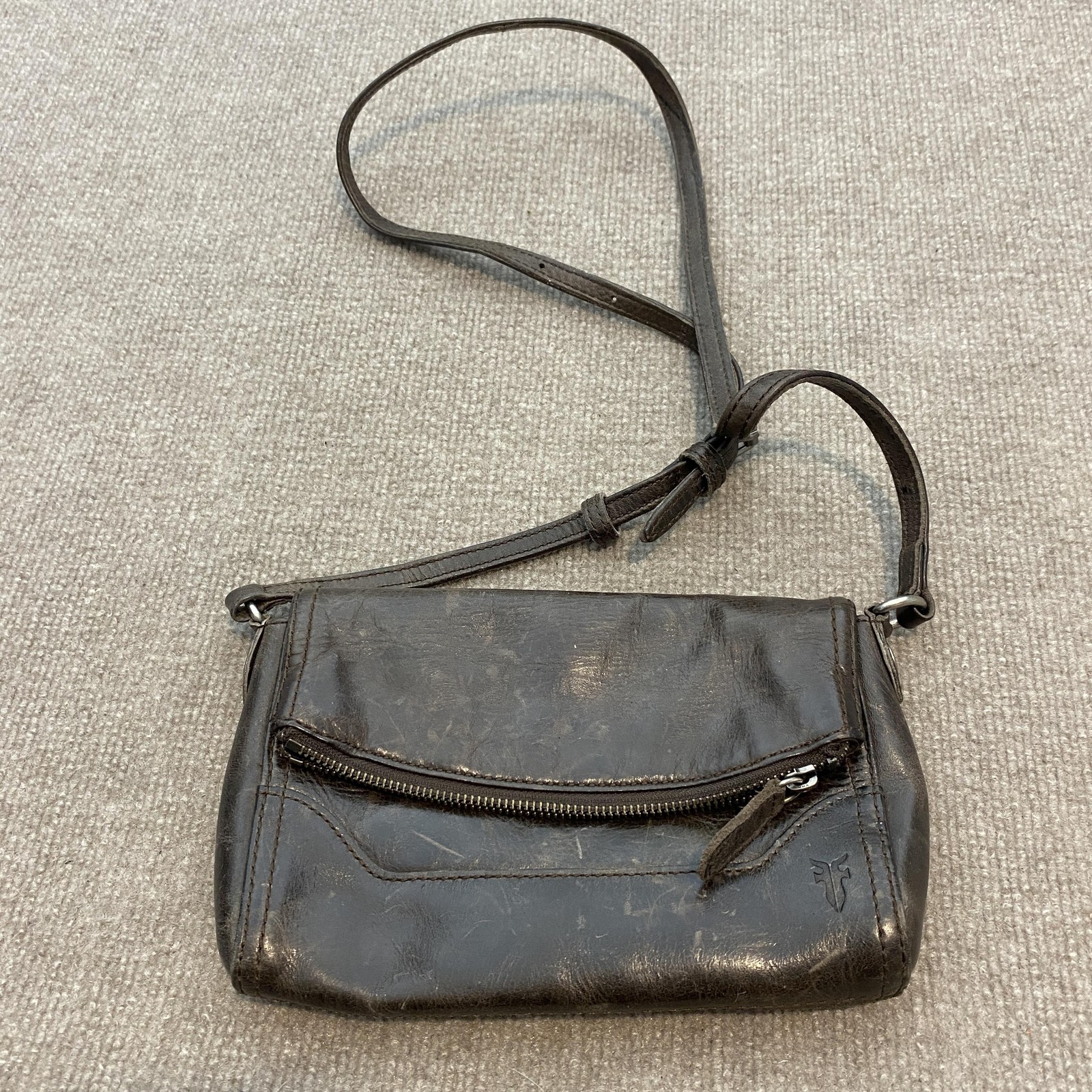 Pre-owned Frye womens leather crossbody bag with moderate wear from prior use. Brown leather exterior shows scuffing, surface scratches, creasing, color variation, and rubbed corners, along with wear on the strap and fraying on the zipper pull tab. Interior striped fabric lining is clean with light lint, and hardware and zippers function properly; bag is sold without a dust bag or additional accessories. Brand: Frye. Style: Womens small leather crossbody bag with long adjustable shoulder strap. Size: Small. Color: Dark brown leather exterior with matching brown strap and antique gold-tone hardware. Material: Leather exterior with leather strap, fabric lining, and metal hardware. Details: Front flap with hidden magnetic snap closure over slip pocket, top zip closure to main compartment, rear exterior zip pocket with leather zipper pull, and interior zip pocket. Features: Hands-free crossbody design, multiple exterior and interior pockets for organizing essentials, and striped fabric lining. Branding: Metal FRYE logo plate on the front panel, embossed Frye logo near the back zip pocket, and interior logo patch on the lining. Special notes: Frye womens brown leather small crossbody bag for casual everyday wear.