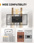 Wide Compatibility: The TV wall mount is compatible with most flat or curved 32″-65″ TVs up to 99 lbs with VESA mounting patterns 100x100 to 400x400mm. The TV mount can be installed on 12″ or 16″ wood studs, concrete, or brick walls. What about 24″ wood studs? Please search for Perlegear PGUE1 TV Wall Mount Extension Bracket. Sturdy & Durable Construction: Featuring strong cold-rolled steel material and a wide sturdy wall plate, this full motion TV mount securely holds your TV in place. It has been rigorously tested including 4x weight capacity tests and 60,000 cycle tests to ensure long-lasting performance. 3 Height Configurations: The TV wall mount includes TV brackets with 3 height settings, allowing flexibility when positioning your screen. Mounting your TV closer to eye level can help to reduce neck and eye strain so you can enjoy your favorite shows and movies with maximum comfort. Full Motion Features: The TV mount is designed with tool-free tilt to adjust your screen 5° up or 15° down for less screen glare. The adjustable TV wall mount also offers +/-45° swivel to direct the TV toward your viewing position and 17.3″ extension for a more immersive viewing experience. Hassle-Free Installation: Mounting our TV wall mount is a breeze thanks to the preassembled arms,the included wall drilling template and clear instructions. Post-installation leveling allows you to fine-tune your TV’s position by +/-4° after mounting. Product Description Perlegear Full Motion TV Mount | Enjoy Ultimate Screen Flexibility Elevate your entertainment space with the TV wall mount PGMF21. Tilt, swivel, and extend your screen for the best viewing angle to watch comfortably from any part of the room. Transform your viewing with a full motion TV wall mount that provides a more cinematic viewing experience. 1 Check before Purchase 2 TV Size & Max Load 3 Wall Types 4 Vesa Pattern 5 Preassemabled TV Mount Our TV wall mount features an innovative tool-free tilt adjustment to adjust your screen 5° up or 15° down for less screen glare. The included TV brackets offer 3 height options that allow you to position your screen at the perfect eye level even after mounting.