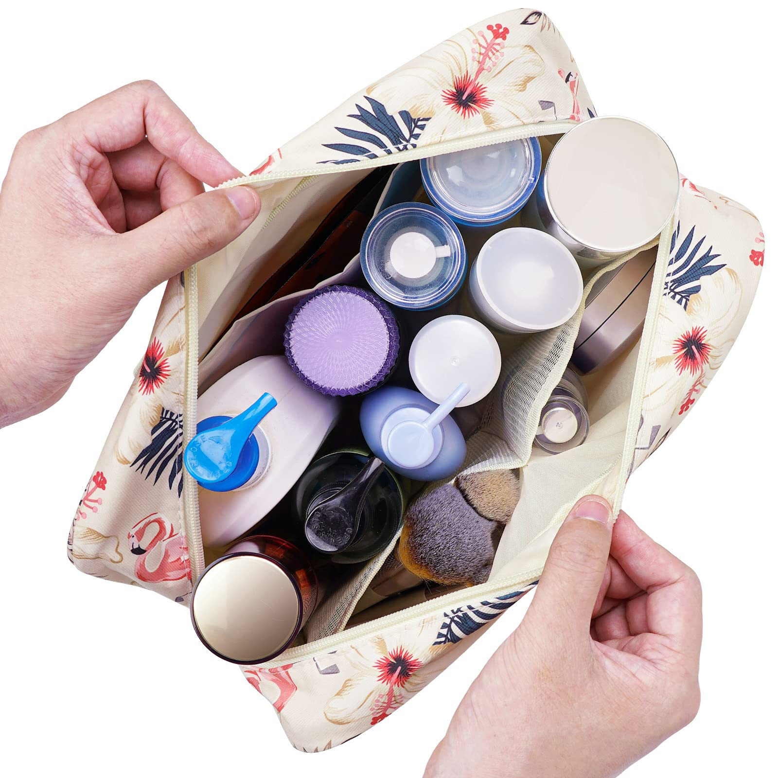 LARGE CAPACITY - Size 11.8"x7.8"x4.7”/30x20x12cm, one main compartment and 3 small pockets could easily fit common-size toiletries as well as makeup like shampoo, conditioner, lotion, toothpaste, toothbrushes, hair brush, shaving kit and a few extra items NOT BULKY DESIGN - large size yet compact design, weighing only 8.8 ounces WATER-RESISTENT - Water-resistent and durable fabric protects your gear from spills, easy to wipe down CONSISTENT QUALITY - Soft fabric, nice lining, reliable zipper, zip-top closure CUTE PRESENT & VERSATILE - Compact, sturdy, portable, lightweight, which makes it good for business trips, travel, gym, camping, home use and more. It would be also a very cute present for women