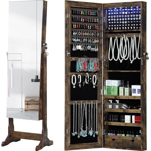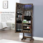 Return Policy Fast Delivery Trusted seller Jewelry Organizer Full Length Mirror Jewelry Cabinet Standing/Wall Mounted Jewelry Armoire Storage with Lights Lockable, Vintage Brown Product Description [Specialized Mirror Jewelry Cabinet] This jewelry cabinet is made of quality solid MDF, suitable for long-term use. The full-length mirror offers a head-to-toe view of your outfit, large storage capacity to help you easily choose the right jewelry and accessories, soft black velvet lining protects your jewelries from scratches, with lock and key safely storage [3 in 1 Design] Standing installation and wall / hanging door mount methods. The frame of jewelry cabinet is pre-assembled, you only need to assemble the legs with included tool, can also mount it on the wall or door with screws to save floor space [Ample Storage Space] Specially designed to store all your necklaces, earrings, rings, bracelets, watches, hair ties, cosmetics and other, with 1 bracelet rod, 2 bottom drawers, 4 storags shelves, 32 hang hooks, 72 ring slots, and 90 earring slots [Lockable & Auto LED Lights] Comes with a lock and 2 keys to prevent children from opening it. the 6 LED lights inside the cabinet emit cozy, soft lighting when you open the cabinet door (the LED lights are powered by 3 AAA batteries, not included) [Full-Length Glass Mirror] Borderless design provides a more comprehensive view, offers a head-to-toe view of your outfit, suitable for makeup and dressing up. When standing installation, t are 3 horizontal holes on each side of the stand, you can adjust the most suitable bevel angle according to your height to get a better view Shipping Returns Payment Shipping Shipping is FREE to all addresses other than APO/PO boxes in the lower 48 states. All our stock ships from US-based warehouses. Shipped via USPS or UPS (depending on location and package weight) Unless stated otherwise, all orders will ship within 24-72 hours of your payment being processed. Check our feedback to see the great reviews of FAST shipping we offer. Returns Seller does not accept returns Payment We currently accept payment via eBay managed payments only. Once payment is cleared, we will dispatch your shipment within 1-3 business days. Please refer to the "Shipping" tab for more information regarding shipping speed to your destination.