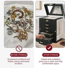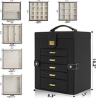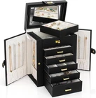 Product Dimension:8.3"W x 5.9"D x 10.3"H. Elegant Durable, Attractive appearance with leather surface and soft velvet lining. Sturdy construction and quality material make it very durable. The jewelry holder can tidy your table and protect your precious jewelry for a very long time .Material: MDF(Medium Density Fiberboard),Velvet,Faux Leather 6 LAYERS with 5 Versatile Pull Out Drawers 2 Hidden Side Cabinets,The top layer is a removable ring layer With big mirror,The two deeper bottoms of the 5 removable drawers has only one compartment; Drawer 1 has 16 equal size slots; Drawer 2 has 9 equal size slots; Drawer 3 has 3 equal rectangle size slots. The 2 Swing out Cabinets including 8 hooks and 2 pockets, help to keep your necklaces from getting tangled LARGE CAPACITY, With 6 versatile pull out drawers, this black jewelry box can store a lot of jewelry accessories, such as rings, earrings, necklaces, chains, bracelets, and so on. Soft pillows in the bottom drawer suit for storing watches. One deeper drawer is designed for sunglasses or large jewelries Large Mirror Grab-and-Go Handle, This mirrored jewelry box comes with a built-in large mirror on top lid, making it easier to dress yourself. The lid has a ribbon attached to keep it from falling back. With a grab-and-go handle, convenient to carry around; delicate buckle for one-hand easy opening, easy to use and saving your time Nice Present, Jewelry Organizer is nice choice for Valentine's Day, Mother's Day, Thanksgiving Day, Birthday and Wedding. Suit for Mother, Girlfriend, Wife, Daughter and So On