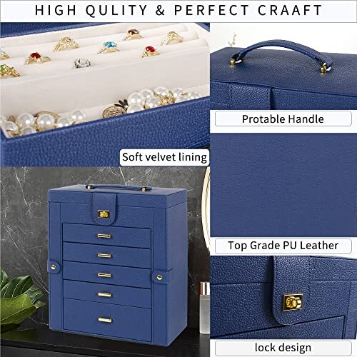 Return Policy Fast Delivery Trusted seller Large Jewelry Box Organizer Functional with Big Mirror, Leather Jewelry Storage Case for Women Girls Ring Necklace Earring Bracelet Holder Organizer Blue Product Description Elegant Durable, Attractive appearance with leather surface and soft velvet lining. Sturdy construction and quality material make it very durable. The jewelry holder can tidy your table and protect your precious jewelry for a very long time .Material: MDF(Medium Density Fiberboard),Velvet,Faux Leather LARGE CAPACITY, With 6 versatile pull out drawers, this jewelry box can store a lot of jewelry accessories, such as rings, earrings, necklaces, chains, bracelets, and so on. One deeper drawer is designed for sunglasses,watches or large jewelries Large Mirror Grab-and-Go Handle, This mirrored jewelry box comes with a built-in large mirror on top lid, making it easier to dress yourself. The lid has a ribbon attached to keep it from falling back. With a grab-and-go handle, convenient to carry around; delicate lock catch for one-hand easy opening, easy to use and saving your time 6 LAYERS with 5 Versatile Pull Out Drawers 2 Hidden Side Cabinets, The two deeper bottoms of the 5 removable drawers has only one compartment; Drawer 1 has 20 equal size slots; Drawer 2 has 12 equal size slots; Drawer 3 has 4 equal size slots. The 2 Swing out Cabinets including 8 hooks and 2 pockets, help to keep your necklaces from getting tangled Nice Present, Jewelry Organizer is nice choice for Valentine's Day, Mother's Day, Thanksgiving Day, Birthday and Wedding. Suit for Mother, Girlfriend, Wife, Daughter and So On Shipping Returns Payment Shipping Shipping is FREE to all addresses other than APO/PO boxes in the lower 48 states. All our stock ships from US-based warehouses. Shipped via USPS or UPS (depending on location and package weight) Unless stated otherwise, all orders will ship within 24-72 hours of your payment being processed. Check our feedback to see the great reviews of FAST shipping we offer. Returns Seller does not accept returns Payment We currently accept payment via eBay managed payments only. Once payment is cleared, we will dispatch your shipment within 1-3 business days. Please refer to the "Shipping" tab for more information regarding shipping speed to your destination.