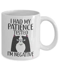 Funny Cat Mug I Had My Patience Tested I'm Negative Coffee Cup White Product Details.. This high quality 11oz. ceramic white mug has a premium hard coat that provides crisp and vibrant color reproduction sure to last for years. Perfect for all hot & cold beverages. The highest quality printing possible is used. It will never fade no matter how many times you wash it. Material: 100% Ceramic. Print both sides. Dishwasher and Microwave Safe. High Gloss + Premium White Finish. Printed in the U.S.A. Personalized & Custom. We support personalized and custom mug to add custom, when placing an order, you can add notes to the "order note" in shipping address section. Also you can contact us directly via message. Shipping Info. Ready to ship in 1 to 2 business days, All products are made-to-order and proudly printed in the United States. Shipped by USPS and DHL, You will receive your order in 5-7 days. Replace & Refund. All products are defective during shipping broken, chipped will be replaced free of charge. You are not satisfied with the product, we will refund 100% money to you. If any other issues arise, please do not hesitate to message, we would be more than happy to assist you.
