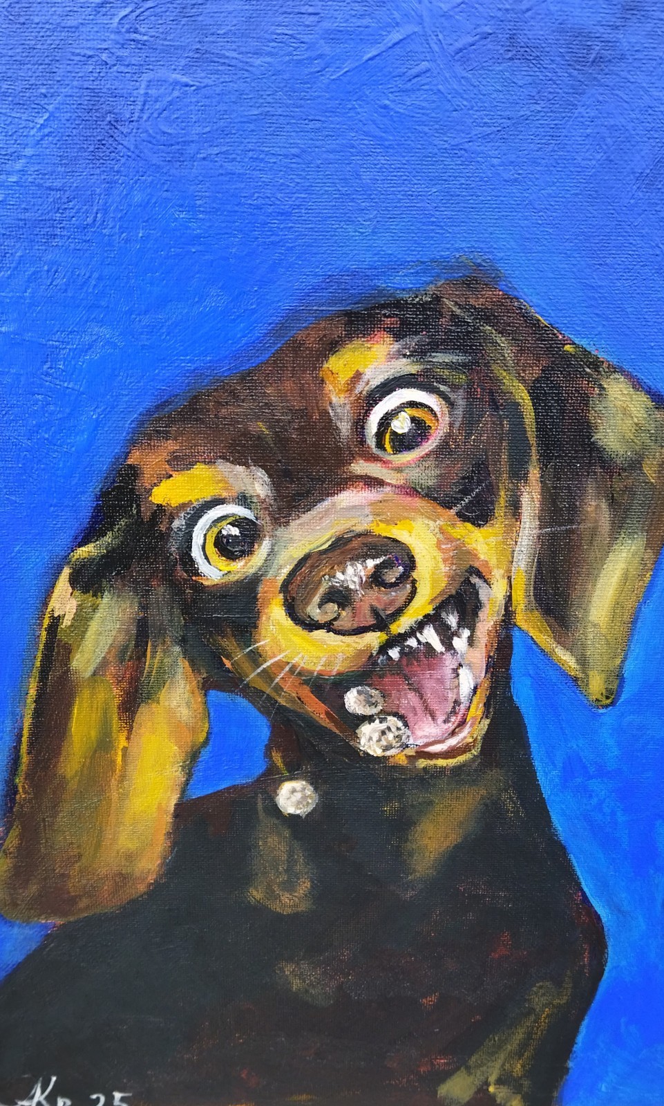 Title: Snack Attack Medium: Acrylic on canvas (unstretched) Size: 35 x 30 cm (14 x 12 inches) Signed by artist: Yes (bottom left corner) Add a spark of humor and personality to your space with this one-of-a-kind acrylic painting of a playful dachshund in the exact moment of catching a flying treat. The dog's goofy expression, wide eyes, and joyful chaos bring energy and smiles into any room. The vivid blue background contrasts beautifully with the rich browns of the dog, making the artwork pop with life and movement. Whether you're a dog lover, collector of animal art, or looking for a unique conversation piece, this original artwork is guaranteed to charm and entertain. Perfect for: ✔️ Gift for dog lovers ✔️ Pet art collectors ✔️ Modern playful interiors Ships carefully packaged in protective packaging.