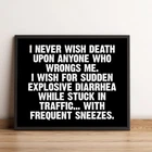Never Wish Death-Funny Wall Sign, This Medium, Printed on Photo Paper.--- Product Details Production Method: All our prints are digitally printed on Luster finish Fuji Crystal Archive Photo Paper for highest quality, clarity and color fidelity to provide a lifetime of enjoyment. Size: Medium Width: 8 inches Length: 10 inches Color: White Distressed Typography on Black Print.---NOTE: Printed on Photo Paper.--- Material: Fuji Photo Paper Finish Type: Satin Number Of Pieces: 1 Printing Type: Flat Surface Treatment Method: Digital/ Flat Product Dimensions : 10 x 8 x 0.1 inches; 2.89 ounces Certified Laughter Starter - Our funny wall decor poster print is a great laughter starter and can be used in practically any space to inspire cheerful moments, our funny wall signs can be used for home decorations, office wall decor, bar decor, shop, man cave decor, and so much more! Frames Are Not Included - This work of art would be a great addition to your room accessories or wall decor posteraesthetic and was printed on premium-quality Luster finished Fuji Crystal Archive Photo Paper, this is unframed and frames are not included in this purchase. Quality Assurance - This funny sarcastic wall decor posterartwork is proudly American made with meticulous attention to detail. It undergoes rigorous quality control measures, ensuring superior craftsmanship and exceptional quality.