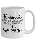 Funny Retired Mug For Cat Lover Funny Retirement Gift Retirement Mug Retirement Gift Retired Mug Retirement Happy Retirement Cat Mom Product Details.. This high quality 11oz. ceramic white mug has a premium hard coat that provides crisp and vibrant color reproduction sure to last for years. Perfect for all hot & cold beverages. The highest quality printing possible is used. It will never fade no matter how many times you wash it. Material: 100% Ceramic. Print both sides. Dishwasher and Microwave Safe. High Gloss + Premium White Finish. Printed in the U.S.A. Personalized & Custom. We support personalized and custom mug to add custom, when placing an order, you can add notes to the "order note" in shipping address section. Also you can contact us directly via message. Shipping Info. Ready to ship in 1 to 2 business days, All products are made-to-order and proudly printed in the United States. Shipped by USPS and DHL, You will receive your order in 5-7 days. Replace & Refund. All products are defective during shipping broken, chipped will be replaced free of charge. You are not satisfied with the product, we will refund 100% money to you. If any other issues arise, please do not hesitate to message, we would be more than happy to assist you.