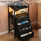 Furnulem Night Stand with Charging Station, Black Nightstand with Drawers and Led Light, Tall Dresser for Bedroom, Bedside Table with Fabric Storage Bins, Metal Frame, Wood Furniture Product Details Color: Black Oak Style: 4 Drawer Brand: Furnulem MPN: TYDS-4D006-Black Oak-1 UPC: Does not apply EAN: Does not apply Brand: Furnulem Product Dimensions: 11.42"D x 16.14"W x 32.91"H Color: Black Oak Product Care Instructions: Wipe with Damp Cloth Table design: Nightstand Brand Name: Furnulem Model Name: nightstand Included Components: Installation Kit Model Number: TYDS-4D006-Black Oak-1 Manufacturer: Furnulem Item Type Name: storage-drawer-units Item Height: 32.91 inches Unit Count: 1.0 Count Color: Black Oak Shape: Rectangular Table Design: Nightstand Style Name: 4 Drawer Finish Types: Polished Furniture Finish: Oak Top Color: Black Item Dimensions D x W x H: 11.42"D x 16.14"W x 32.91"H Item Weight: 14.62 Pounds Size: With Socket and Light Extended Length: 16.1 Inches Indoor Outdoor Usage: Indoor Tools Recommended For Assembly: Screw Driver Frame Material Type: Metal Top Material Type: Wood Product Care Instructions: Wipe with Damp Cloth Is Stain Resistant: No Material Type: Wood Handle Material: Metal Number of Drawers: 4 Number of Items: 1 Is the item resizable?: No RGB Led Light Strip: Equipped with the RGB lighting strips, there are multiple color, brightness levels, and various flashing modes for you to choose from. Even the LEDs will dance along in sync with the rhythm when you play tunes. You can create the perfect lighting setting to complement your mood and decor. Charging Station: The built-in power outlets provide the ultimate convenience. This bedroom table includes 2 AC outlets and 2 USB ports. You can easily connect and charge your electronic devices, such as smartphones, tablets, or bedside lamps without the need for extra extension cords or searching for available outlets. Ample Storage Space: The four spacious fabric drawers offer ample storage space for your personal belongings, allowing you to keep your essentials organized. Additionally, the 2-layer wooden shelf provides additional open storage space, allows items to be displayed and within reach. Easy to Install: With straightforward instructions and minimal tools required, the process becomes quick and hassle-free. You can install this LED Nightstand in 20 minutes according to the instruction. And there is also installation video on the listing for your reference. Sturdy Structure: Constructed from high-quality materials, this nightstand with charging is durable and long-lasting. The overall frame is made from metal and the shelf is wooden. And the anti-toppling device is provided to help to reduce the risk of injuries, especially important in households with children or pets.