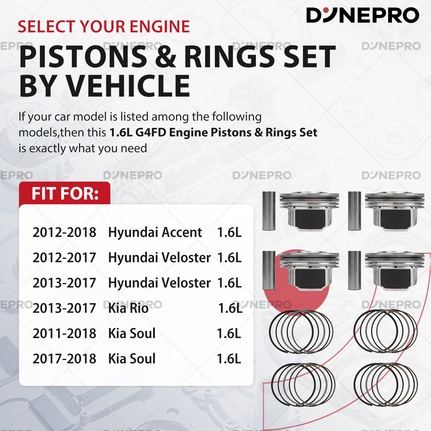Engine Parts Installation Guide About Us Contact Us Feedback Dynepro® Pro Series Master Engine Rebuild Kit For Hyundai OEM Spec Certified Engine Repair Kit Precision Engineered · Factory Reliability ⭕Aluminum Piston Set Hypereutectic Al-Si18 Alloy : Low thermal expansion, 20% lighter than cast iron. Molybdenum-coated skirts : Reduces cylinder wear by 35% in stop-and-go city driving. Integrated cooling channels : Optimized for turbocharged Gamma/Theta II engines,lifespan by 2x. ⭕ Built For Hyundai Owners: ✔️ Oil sludge cleanup (Theta II/Lambda engine rebuilds) ✔️ Timing chain rattle fixes (Nu/Gamma engines, includes tensioner tool) ✔️ Turbo failure prevention (1.6T/2.0T models, full gasket/seal refresh) ✔️ 200,000km+ overhauls (full bolt kit with factory torque specs) ⭕ For Hyundai TechTrust : ✔️ Restore factory power. Drive with Korean precision. ✔️Order Now – Free OEM Repair Manual Included! Support: Email us (Master Techs on call) ⭕ Why Genuine? ⚠️ Cheap parts fail: Non-genuine pistons crack under GDI’s 150-bar fuel pressure. Knockoff chains stretch, causing valve-piston interference. ✅ for Hyundai spec Certified : 100% material compliance with Hyundai MS-350 durability standards. Direct from OEM Plant spec suppliers. 5-year unlimited-mileage warranty. Vehicle Application Compatible with: G4FD 1.6L engines. for Hyundai Accent 2012-2018 1.6L GAS Naturally Aspirated; for Hyundai Veloster 2012-2017 1.6L GAS Naturally Aspirated; for Hyundai Veloster 2013-2017 1.6L GAS Turbocharged; for Kia Rio 2013-2017 1.6L GAS Naturally Aspirated; for Kia Soul 2011-2018 1.6L GAS Naturally Aspirated; for Kia Soul 2017-2018 1.6L GAS Turbocharged Note: VIN confirmation required. What's included in this complete bundle set -Pistons -Piston Rings -Connecting Rods Shop Now >> Instant Fitment Email your Hyundai model (e.g., Elantra, Tucson, Santa Fe) and year → Get a repair kit tailored to your VIN. Restore factory power, drive like new. Tech Support: Email us (Provide VIN for tailored parts list) Learn More Learn More Learn More PAYMENT We accept eBay managed payments for all orders. If you have any questions, please contact us. SHIPPING Ordering this kit requires additional information: the vehicle engine model as well as the VIN (17 digits), and also requires you to verify a match to your vehicle using the vehicle application data on Ebay. Be sure to provide this information when placing your order or via a separate message. Product will be shipped within 1-3 business days after full payment is received and verified. Delivery Time is about 3-7 business days to most of countries. We ship the package to your shipping address in eBay instead of the one in PayPal. Please tell us your shipping address if it is different from the one in eBay. RETURNS We offer eBay's best return policy. If you utilized Ebay's fitment and the parts you received do not fit your vehicle, we will pay to have them returned. Should you desire to return this kit for any other reason, Includes kits that are incorrect because you did not provide the VIN in the order notes, you will be responsible for return shipping. These kits are heavier and cost more to ship, so we ask that you provide vehicle information and verify suitability before ordering.Unfortunately, we cannot accept returns from international customers at this time. ★★★★★ So far the engine overhaul kit has performed well. I love the performance with this kit installed. On my 2004 F150. Installation was easy. Everything is perfect. Considering this kit is cheap, it doesn't get any better than this. ----James ★★★★★ This was a great price. lt was made in the USA. After 10,000 miles it is running great. ----Liam ★★★★★ As of the time of this review this is well worth the money and it fits as it should. ----Noah ★★★★★ This set was installed perfect fit. lt has been installed on a truck that has been used very much every day. Working perfect and so much cheaper than the auto stores. ----Ethan ★★★★★ Seemed to be a perfect replacement part and it works. ----Oliver ★★★★★ Everything fit how it was supposed to and have been driving it for a week with no problems. ----Benjamin ★★★★★ The seller was very nice and provided me with professional advice on the installation, which was a breeze and is still going strong after 10,000 miles. ----Michael