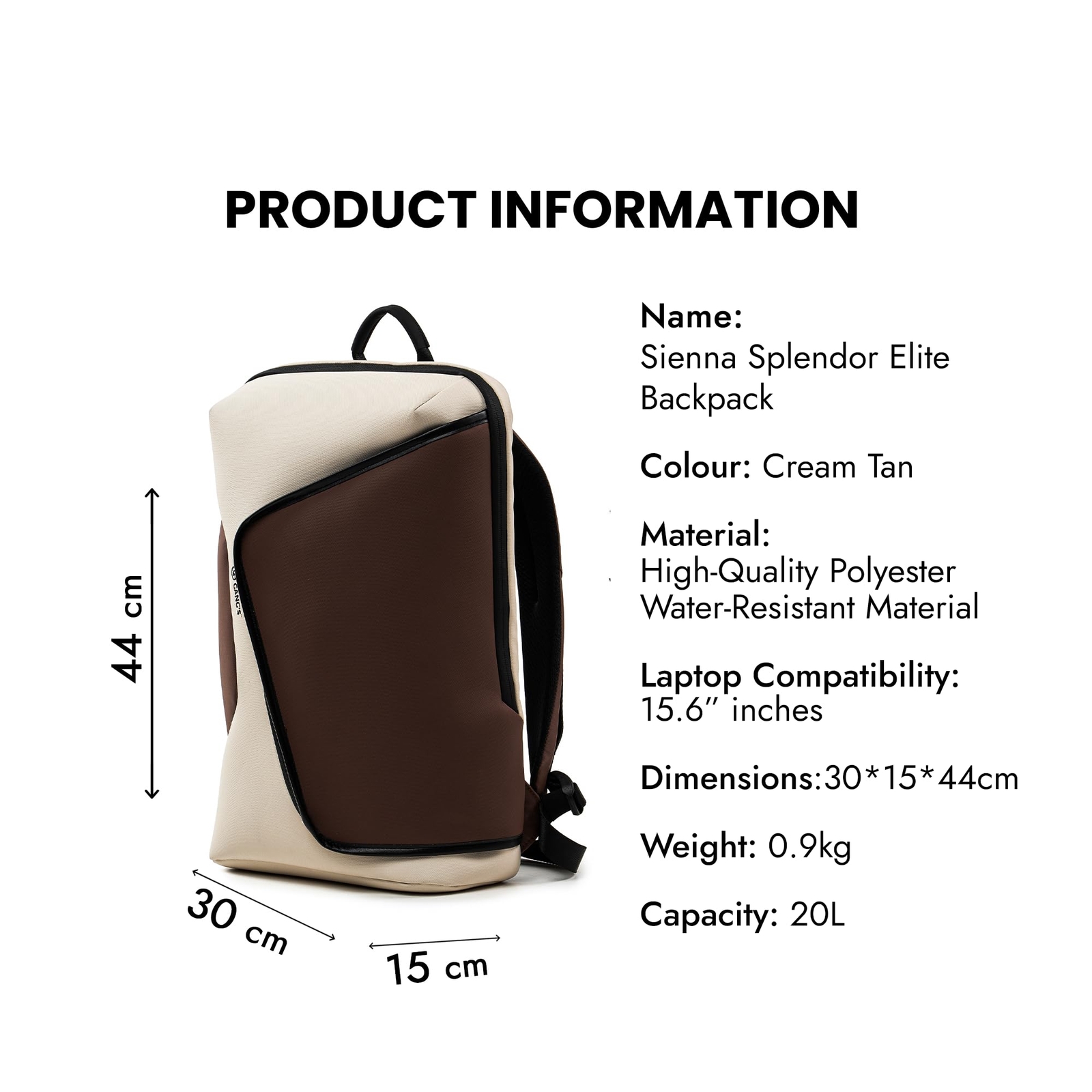 Care Instructions: Wipe with Damp Cloth Only. Fit Type: Regular Exceptional Craftsmanship with Premium Materials: Skillfully crafted from a polyester blend, creating an artistic appearance. The design is meticulously thought out, boasting a creative and structured aesthetic. Plus, it's completely water-resistant. Carry it all with confidence: Our backpack boasts a 15" laptop sleeve, an iPad sleeve, handy pouches for stationery, mobile devices, and wallets, an elastic belt for files, plus extra room for your personal essentials on the go. Stay organized and comfortable on the move with our feature-packed backpack: it's got a designated spot for your wallet, two pen pockets, an ID or key holder, dedicated space for your mobile and power bank, a convenient cardholder on the shoulder strap, a discreet side zipper pocket, a trolley handle holder, and cushioning on the back for ultimate comfort. Built to withstand the elements, our backpack comes equipped with water-resistant fabric and a water-resistant inner lining. Plus, it's impressively lightweight, weighing just 0.9kg, and features a YKK smooth puller water-resistant zipper for extended durability. Optimal Storage Capacity: The SiennaSplendor Elite Backpack offers a generous 20L capacity, with dimensions measuring 30 x 15 x 44 cm.