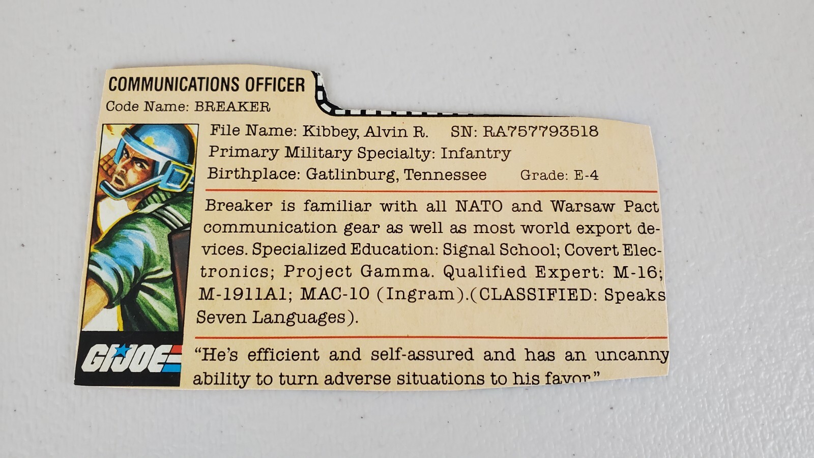This listing is for the 1982 version of the GI Joe action figure, Breaker. The 1982 version of Joe figures are known for not having the swivel arms. Some figures released from Series 1 were rereleased as in 1983 with swivel arms. One of the things I always remember from actually playing with these guys was that the thumbs would sometimes break off. Check out my pictures for this guy and you will see that his thumbs are both there. He comes with all his gear as well as his filecard. CHECK OUT MY OTHER LISTINGS!! I am and will be selling many other toys from my personal collection - all from the 80's. Many more Joes, some Star Wars, and lots of Japanese stuff (GoDaikin, Macross, Transformers). If you're picking up multiple items, send me a message and I can combine shipping. Thanks for stopping by!