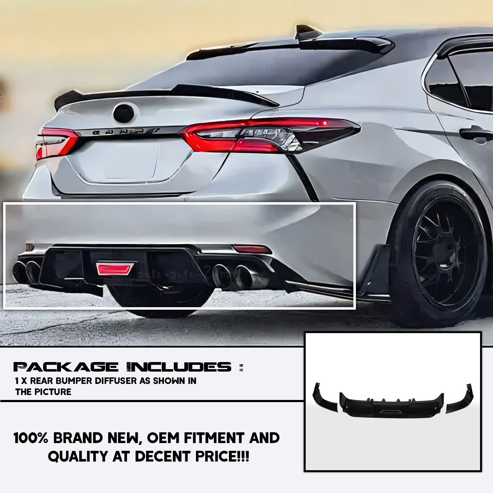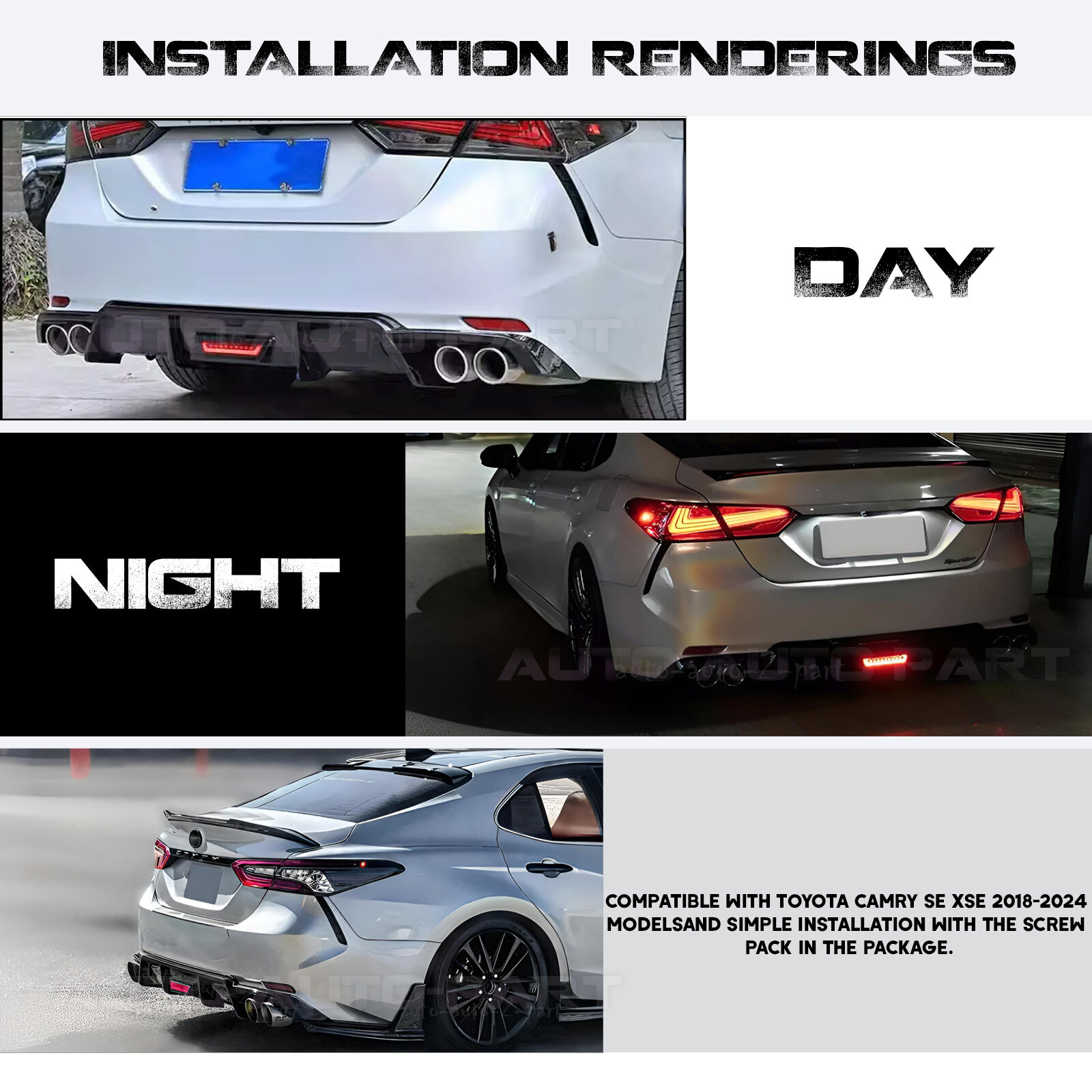 Home Payment Shipping About us Contact us Details Product Information Fits All Models Below For Toyota Camry SE XSE 2018-2024 Package Included 1 Set of Rear Bumper Diffuser W/ LED Brake Light as Shown in Pictures. About This Item Feature Description Condition 100% Brand New Fitment OEM Fitment and Quality at Decent Price! Components Comes as 3 Separated Pieces, Hardware Included. Color Glossy Black Material Made of Durable & Light-Weight ABS Plastic Material Features Rear Diffuser with LED Brake/Stroke Lights at Decent Price. Design Shark Fins Aerodynamic Design with Brake Lights. Appearance Will Dramatically Improve the Sporty Appearance for Your Car. Important Notes Installation Template: NOT Included. Professional Installation is Highly Recommended. Inspection: Please Inspect the Item Carefully and Perform a Dry-Test Before Installation or Painting. Return Policy: Any Items Modified or Damaged During Installation Will Not Be Qualified for Return/Exchange. Safety Reminder: Ensure the Item is Securely Installed Before Driving. We Won't Be Responsible for Any Items that Flew Off/Missing Once in Use. Feedback Policy: Negative Feedback WON'T Help Resolve Issues and Might Void the Item's Warranty. Please Contact Us via the eBay Messaging System Before Leaving Negative Feedback; We Will Try Our Best to Resolve Issues! Contact Us: Please Don't Hesitate to Contact Us If You Have Any Questions. Shipping Policy Payment Method Returns Policy Shipping Policy All orders will be shipped within handling time ( Business Days ) after the payment is cleared. We use Standard / Expedited Shipping Service: all shipments will be with valid tracking number. If you didn't received your shipment within estimated shipping time , please contact us. We will check and offer a good solution to you . Our goal is customer satisfaction! Payment Method We accept multiple payment methods which ebay allowed . For faster service, please update your correct address before sending payment. We do not accept any transaction methods other than ebay. Returns Policy We offer 30 days exchange or return and money back policy If you feel unsatisfied with our product for any reason , please contact our professional customer team within 30 days ,you can choose exchange , return or refund , we will take care of your issue . If the product is defective or damage upon arrival, please contact us immediately don't open dispute , we will spare no effort to offer the best solution . As most of our products are aftermarket car parts, which DO NOT come with instructions.PROFESSIONAL INSTALLATION is highly recommended. Before install your item, please refer to internet or your local Auto parts store for some tips. Buyer assumes all risks for any improper installation and usage. NOTE : Any item that is approved for exchange or return, item will need to be in brand new condition, which means the item is never installed and needs to be kept in original packaging. Fees will be applied for missing parts or damages. We don't accept return if item got used , modification painting or damaged for improper installation. Whatever happens, please contact us. Our goal is 100% customer satisfaction. We will reply you within 24 hours on working days. On Feb 19, 2025 at 20:05:56 PST, seller added the following information: