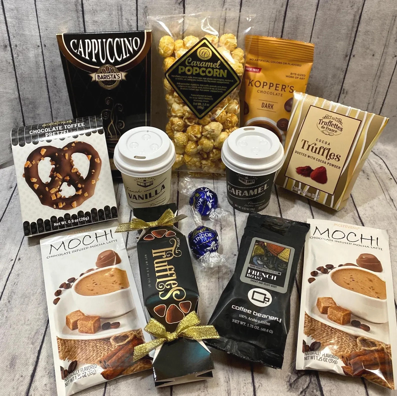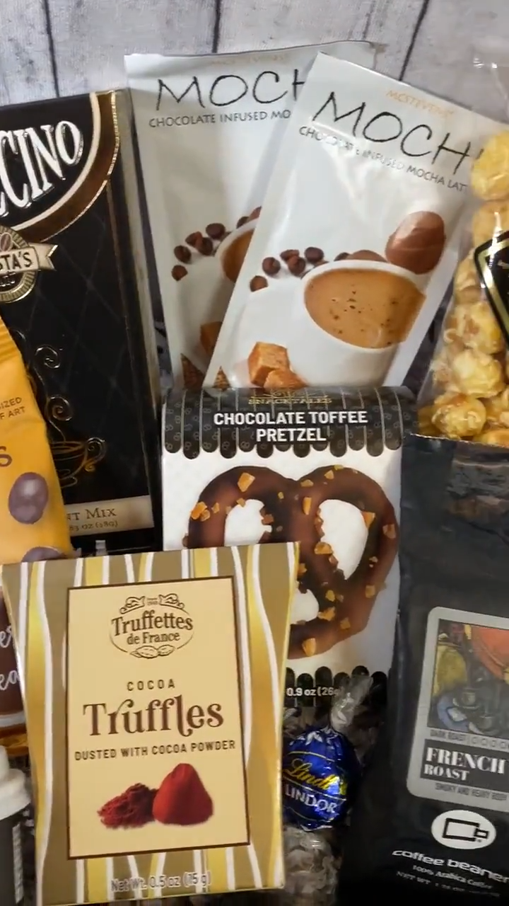 Gourmet Coffee Gift Box ☕~ This a the perfect all occasion gift! Whether you need a Thank You gift, Birthday, Employee or just a I'm Thinking of you gift~ This has you covered with a wonderful assortment of coffee, snacks and lattes. Hand packed with care, this gift is sure to please! Gift Set comes in a white gift craft box with a bow and crinkle shreds then placed in a shipping box. Anything breakable will be bubble wrapped to ensure it arrives intact. We ship in 3 days but please allow extra time for USPS. Please message me with any questions. Personalize the gift with a note for the recipient, making it a thoughtful present for family or friends who enjoy a good cup of coffee. Set includes~ 1~ Gourmet Caramel Popcorn. 2~ Chocolate Infused Mocha Latte (Mochi) Packages. 1~ Koppers Gourmet Chocolate Covered Espresso Beans. 1~ Cappuccino Instant Package. 1~ Chocolate Toffee Bavarian Pretzel. 1~ Coffee Beanery Ground French Roast Coffee- Makes 1 pot! 2~ Truffle Boxes. 2~ Mini Coffee Cups- Instant coffee in cute "To-Go" cups! 2~ Lindt Chocolates added for that extra touch. Thanks for looking! Visit TheGiftyGrape for more gifting ideas!