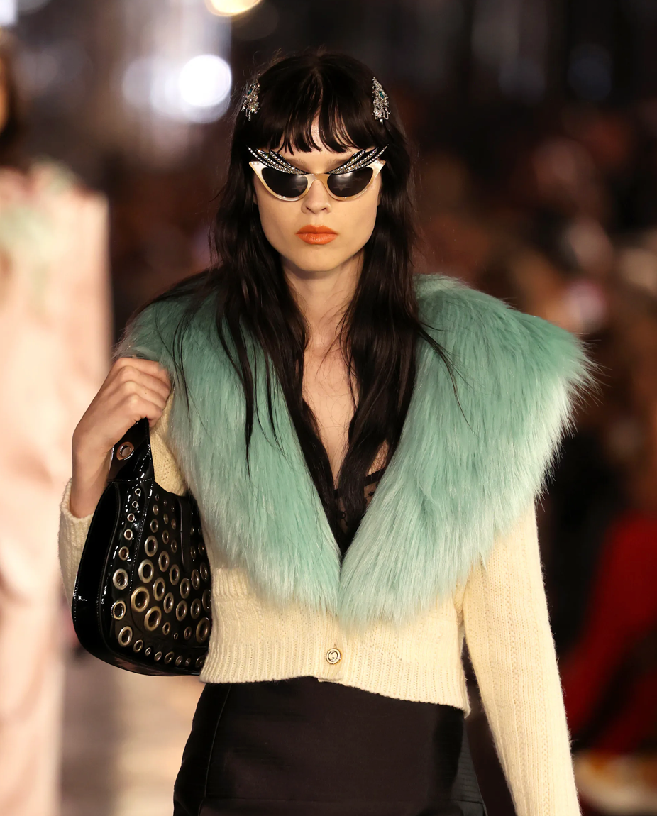 Spring, 2022 Gucci. Experience the glamour of the "Love Parade" with these stunning cat eye sunglasses. Adorned with sparkling silver and gold studs and rhinestones, these sunglasses in soft marbled pink with black lashes will elevate your style. The store tags, dust bag, and case are all included for a complete luxury experience. Purchased directly from Neiman Marcus. Condition: Never Worn, New in Case Item# 106197