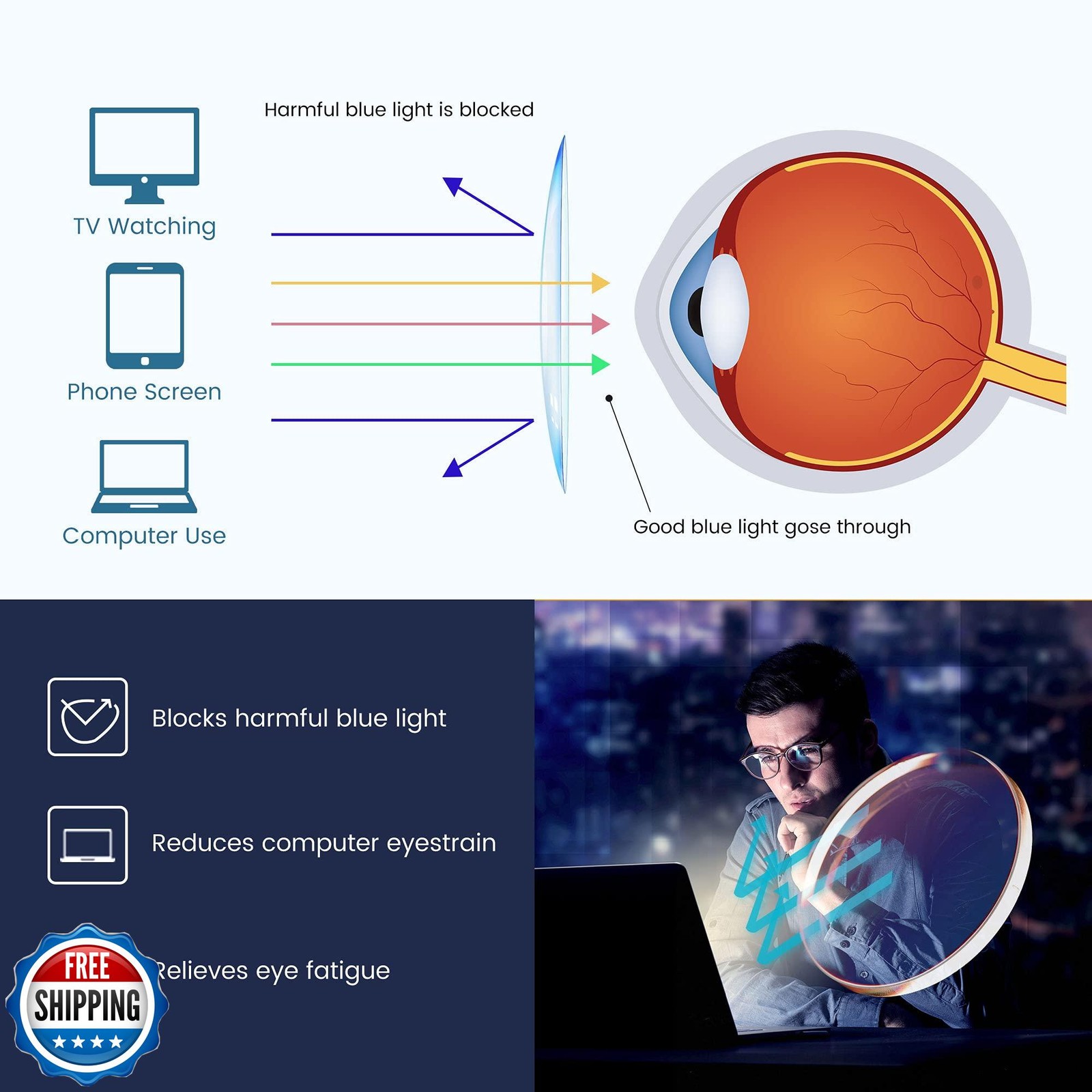 GUDVUE Blue Light Glasses, Computer/Gaming/TV/Phones Glasses for Women/men, Anti Glare/UV400/Eye Strain, Oval Black/Silver Features [Premium Polycarbonate Lens] Offer the newest high-tech lens, barely tinted, and improve clarity of your glasses to restore the true color. The Lens are anti-scratch coated to improve the durability of the glasses. Our Lens are anti-reflective to reduce glare. Polished metal technology, pass the 48-hour ongoing reliability test, is not easy to fade, and has no pressure on the bridge of the nose! [Blue Light Glasses] You can filter a great percentage of the harmful light coming at you from your electronic devices. Reduce eye strain, fatigue, migraines, headaches & glare after long periods of working, gaming and reading. Improved sleep quality, focus and productivity. [Spectrum Report] GUDVUE care about your eyes, our products all come with Spectrum report. Please Note Non-prescription and non-magnification. [Package Includes] Include blue light glasses*1, Glasses Cleaning cloth *1, Glasses case *1, blue light test electric torch*1, blue light test card*1. [Rest assured to buy] We stick to pay attention to product quality, any problem for this product, just contact the seller without any hesitation and we will provide you the best service! Shipping Free & Fast Shipping: We offer free shipping to most of the USA with a normal delivery time of 3-7 days. However, due to the current situation, additional delivery time (up to 3 weeks) may be required for some items. Alternative Carriers: We may use alternative carriers (e.g., USPS, FedEx, UPS) to ensure your package arrives safely and on time. Due to the use of multiple carriers, we are unable to provide a tracking number automatically. Handling Time: Orders are processed and shipped within 1-2 business days of receiving cleared payment. Shipping Restrictions: Shipping to Alaska, Hawaii, Puerto Rico, Guam, and other US territories may incur shipping charges or delivery restrictions. Please contact us before ordering, or your order can be refunded/cancelled. State Restrictions: Certain items may not be shipped to California due to state regulations. Contact for Tracking Updates: If you require tracking updates or have any concerns about the delivery of your order, please feel free to contact us, and we will be happy to assist you. Return Policy 30-Day Hassle-Free Returns: If you are not completely satisfied with your purchase, you can return the item for free within 30 days of receiving it for a full refund or exchange. Easy Return Process: Contact us, and we will provide you with a prepaid return shipping label and detailed instructions. No Restocking Fee: There are no restocking fees for returns. However, the buyer is responsible for return shipping costs if the return is not due to a seller"s error. Refund Processing: Refunds will be processed within 1 business day of receiving the returned item in its original condition. Feedback Your feedback is extremely important to us. We strive to provide the best products and customer service possible. If you are satisfied with your purchase, please take a moment to leave us a positive review. If you have any concerns or issues with your order, please contact us before leaving negative feedback. We are committed to resolving any problems and ensuring your satisfaction. Contact Us If you have any questions or concerns, please feel free to reach out to our customer support team. You can contact us through the eBay messaging system. We are available Monday to Friday, 9:00 am to 5:00 pm EST, and we will do our best to respond to your inquiry within 24 hours. Thank you for supporting our small family business!