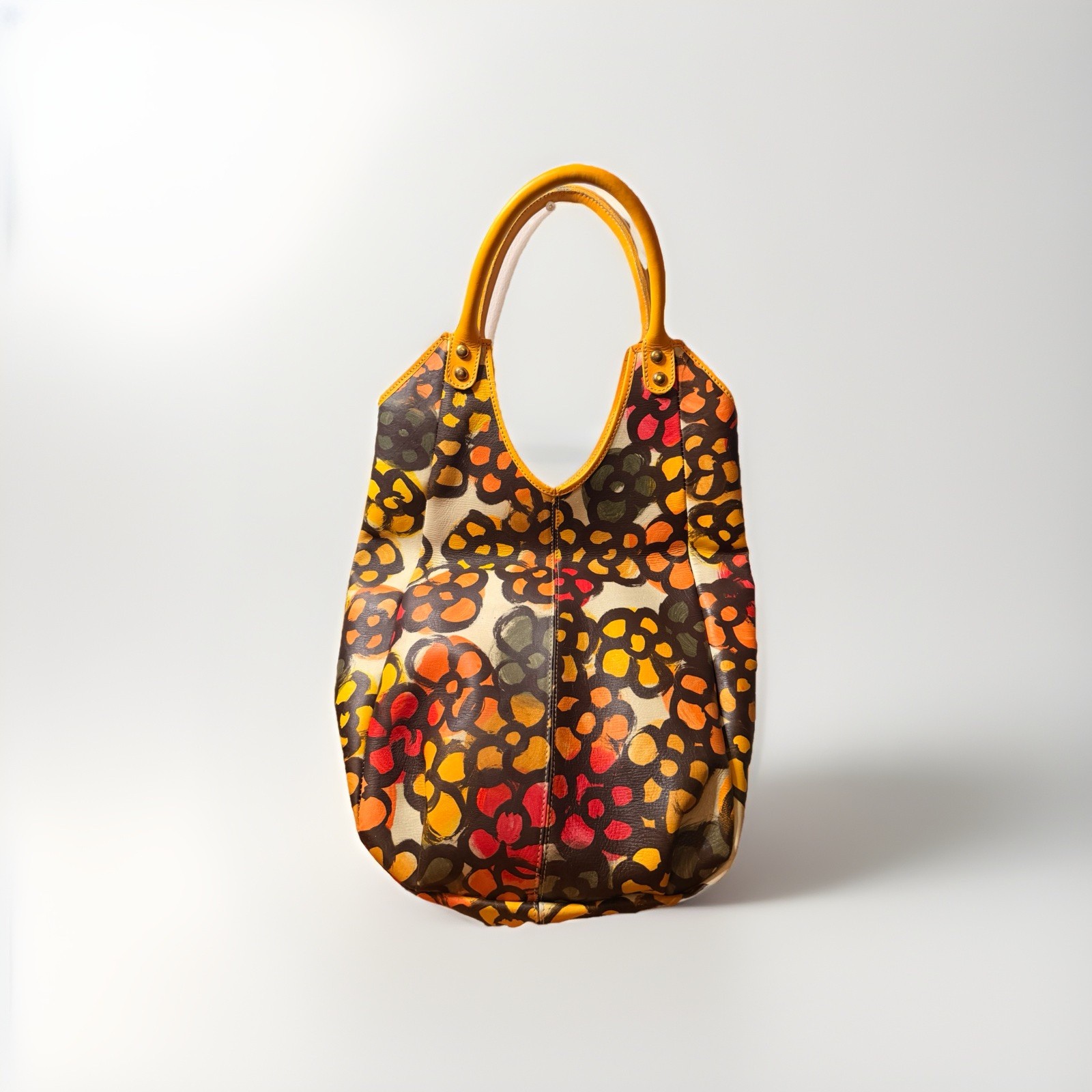 The Gabi Arenas Animal Print Tote with Yellow Handles & Logo Plaque is a stylish and versatile handbag perfect for casual occasions. Made of leather with a fabric lining, this rectangular-shaped tote features a magnetic closure and double yellow handles. The animal print pattern, along with the colorful logo plaque and gold hardware accents, adds a touch of designer flair to the bag. With inner pockets for organization, this tote is both practical and fashionable for the modern woman looking for a statement piece to add to their collection. Made by Colombia designer Gabi Arenas. This is a unique piece similar to that of Fendi. Contemporary and avant garde