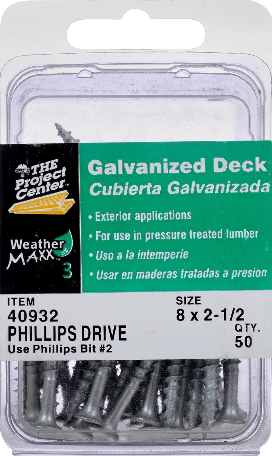 Fastener 40932 Galvanized Phillips Drive Deck Screw, 8 X 2 1/2-Inch, (Pack of 50) The product is 50 Pack, #8 x 2-1/2",Galvanized Deck Screw, Hardened Steel, Coarse Thread, Flat Bugle Head, #2 Phillips Recess. Easy and simple use kit The product is manufactured in China Galvanized screws Coarse thread Galvanized screws Coarse thread Sharp Point, Bugle Head Shipping We offer FREE shipping on all orders! We ship within Three business days of payment, usually sooner. We use a selection of shipping services such as UPS, FedEx, USPS etc. We only ship to the lower 48 states, no APO/FPO addresses or PO Boxes allowed. Local pickups and combined shipping options are not provided at this time. Return You can return a product for up to 30 days from the date you purchased it. Any product you return must be in the same condition you received it and in the original packaging. Please keep the receipt. Payment We accept payment by any of the following methods: PayPal Please pay as soon as possible after winning an auction, as that will allow us to post your item to you sooner! Feedback Customer satisfaction is very important to us. If you have any problem with your order, please contact us and we will do our best to make you satisfied. Contact Us If you have any queries, please contact us via ebay. We usually respond within 24 hours on weekdays. Please visit our eBay store to check out other items for sale! Thank you for shopping at our store.