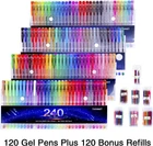 All Unique Colors: Tanmit gel pens set bring 120 colors to your life. Including Glitter, Metallic, Neon, Pastel, Fluorescent, Dye Colors, Rainbow, Standard. Extra 120 Matched Refills: Those ink has 20% more ink than normal gel pens. What a great GIFT for children, teens and adults who love to color. ??????You can find ???COLOR NUMBERS??? on each refill tube,then you can match the refills to the pens. Unlimited Uses: Ideal for drawing, doodle, coloring, scrapbook, writing, doodling, journaling. Also show your creative side like greeting cards, invites, decorating, journaling & more! High Quality and Smooth Ink: Non-toxic, acid-free and conform to ASTM D-4236 standards. Long lasting ink and durable tips for smooth writing. What You Get: 120 gel pens, 120 refills, folding packing. Worry-free warranty, and friendly customer service. Pack of 240 Gel Pens (120 Unique Gel Pens + 120 Refills) Incredible vibrant and bold colored assortment of superior artist quality gel pens that include Standard, Glitter, Metallic, Neon, Pastel, Rainbow and Dye Pigment Colors. Super smooth writing every time. Safe for children. Perfect for the young aspiring artist to the established art professional. Detail of 120 Colors: 28 x Glitter 20 x Metallic 19 x Neon 16 x Pastel 16 x Fluorescent 11 x Dye Colors 6 x Rainbow 4 x Standard Upgraded version of gel pens You will get the pens which writing smoothli without Skips and don't smear, fade or skip. Exceptional writing pens that provide consistent free-flowing ink with a smooth glide that allows you to create perfect lines with every use. Strong durable 0.6 to 1.0 mm tips. Easy-Open Case + Convenient Storage = Great Gift! This time we bring 4 different snap pouches in this set.Foldable design makes it easy to store in a backpack, drawer, locker, or shelf. Besides,all the gel pens and refills are package in colorful case.The package is important when you are choosing a gift. So our design will be more attractive.Just add it to your cart. Package including 120 x Color Gel Pens 120 x Gel Ink Refills 1 x Greeting Card 1 x Durable Carton