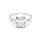 Genesis Engagement Ring Sterling Silver Baguette Cz Womens Ginger Lyne Collection Delve into the essence of elegance with the Ginger Lyne Collection's heartfelt cocktail ring, a testament to luxury and refined craftsmanship. Radiating with confidence, this stunning statement piece is adorned with a mesmerizing 10mmx8mm emerald-cut cubic zirconia, encapsulating both fire and brilliance. Designed with an 11mm width, the band is forged from the finest .925 sterling silver, ensuring longevity and lustre. Complementing the central gem are two graceful baguette accents, elevating its grandeur. The AAA+ quality of the cubic zirconia stones is indicative of impeccable clarity and sparkle, a testament to the ring's unmatched caliber. To further attest to its genuine composition, the ring boasts a rhodium plating, ensuring a luminous, non-tarnish finish and is stamped with the 925 hallmark, sealing its authenticity. Whether as a birthstone emblem, an engagement symbol, or a testament of eternal commitment, this cocktail ring encapsulates timeless beauty and splendor. Emerald Excellence: Features a breathtaking 10mmx8mm emerald cut cubic zirconia, radiating unmatched brilliance. Stately Silhouette: Boasts an 11mm width band, exuding confidence and grandeur. Sterling Purity: Crafted with high-quality .925 sterling silver, ensuring a lustrous shine and durability. Add this to your cart Now! Enhanced Beauty: Flanked by two elegant baguette accents, amplifying its sophistication. This product is intended for use of Fashion Jewelry for Adults. It is not recommended for ages under 13. Seal of Authenticity: Rhodium-plated for a radiant finish with a hallmark ".925" stamp, assuring genuine composition. Ginger Lyne Collection is a US Registered Trademarked Brand