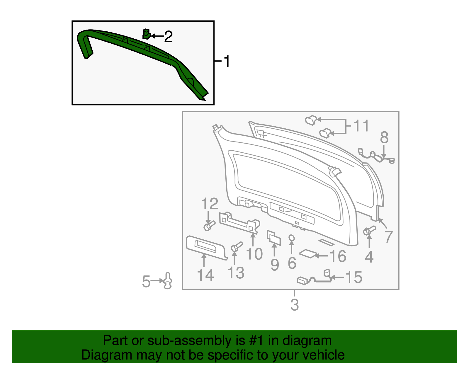 VRAY-GMC Genuine GM Upper Trim Panel 15803157 Part can be found as # 1 in the diagram above Product Description Without power lift gate, cashmere. Specifications Brand GM Manufacturer Part Number 15803157 SKU 15803157 Product Genuine GM Upper Trim Panel 15803157 ONLY PART REFERENCE #1 ON THE DIAGRAM IS INCLUDED WARNING : May cause cancer and reproductive harm. See www.P65Warnings.ca.gov for more info. Terms and Conditions Thank you for shopping with us. Please find our policies below. If you have any other questions, please don't hesitate to contact us. Shipping Terms In stock orders ship within 24 hours. Weekend orders will be processed the next business day. If a part is not in stock and must be ordered from the manufacturer, it usually takes 2-3 days to arrive to us and will be promptly shipped to you. Most of the orders are shipped complete within 2-3 business days. A few of the parts ordered from the manufacturer may take up to 5-6 business days to arrive and will shipped to you immediately. Depending upon location, ground shipments usually take 2-7 days. Your order may be shipped Overnight for an additional cost. Oversized shipments will be additional; you will be contacted prior to shipping for approval. We cannot guarantee transit times for ground and oversize orders. Shipping Carrier substitutions may be made at our determination in an attempt to reduce shipping cost to the customer. We do not ship internationally. In the unlikely event that a part has been placed on backorder or discontinued, we will do our best to try and find one for you as quickly as possible. We do not ship COD orders. Return Policy Contact us to arrange for any returns. A copy of the invoice will need to be included with the return. Parts must be resaleable and in the original packaging. We cannot take back used parts. We cannot take back installed or tried parts. Electrical parts are not returnable. We do reserve the right to refuse and return any parts we find have been installed, are used or do not meet the above criteria. Return request need to be within 30 days of receipt. Cancellation Policy An order or a portion of an order may be cancelled up until the time it is shipped and no longer in our possession. Home • Newsletter Signup • Contact Us Copyright © 2025 VRAY-GMC , All rights reserved. Solution by RevolutionParts, Inc. :: Design by OCDesignsOnline