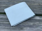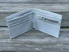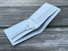 White Card Holder Genuine Leather Card Holder Bifold Men Handmade Purse Color = White Size: 9 inches length (opened) x 3 1/2 inches wide, 4 1/2 inches (closed) Hand Made Genuine Real Leather 4 slots for credit/bank cards 2 separated slots for bills, one with zip 2 Hidden pocket behind the credit/bank card slot 1 coin pocket with zip Made in Pakistan