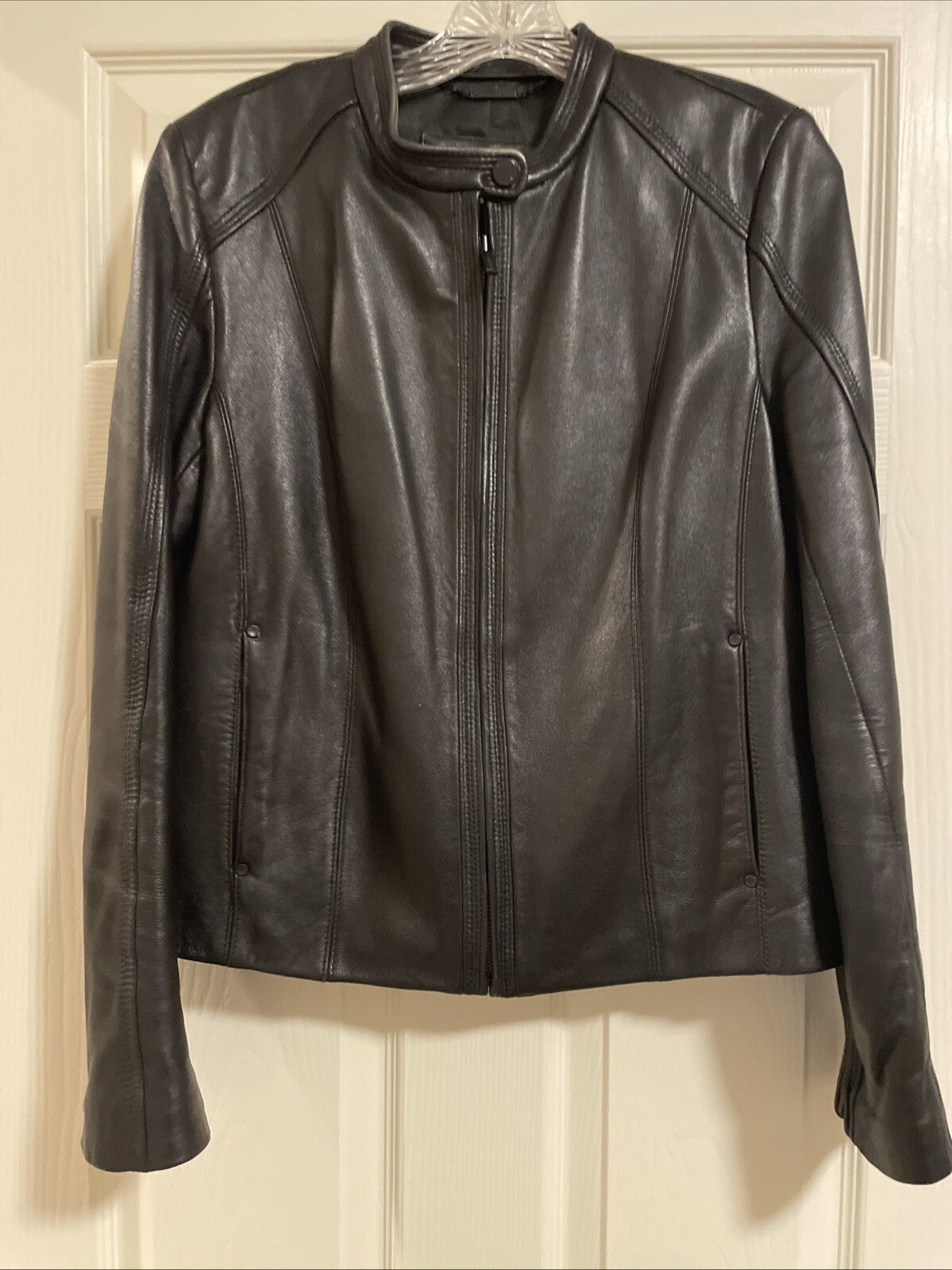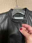 Upgrade your wardrobe with this stylish and versatile Calvin Klein jacket. Made from 100% genuine leather, this black zip-up jacket is perfect for travel, business, or casual occasions. The jacket features two side pockets, a full zip closure, and 2 inner pockets for added convenience. The classic style makes this jacket a timeless addition to your wardrobe. Available in size L, this regular fit jacket is suitable for women who want to look fashionable and feel comfortable. Pit-to-pit measurements 18 inches. Length 22 inches ( measured in the center of the back top to bottom). Pre loved excellent condition.