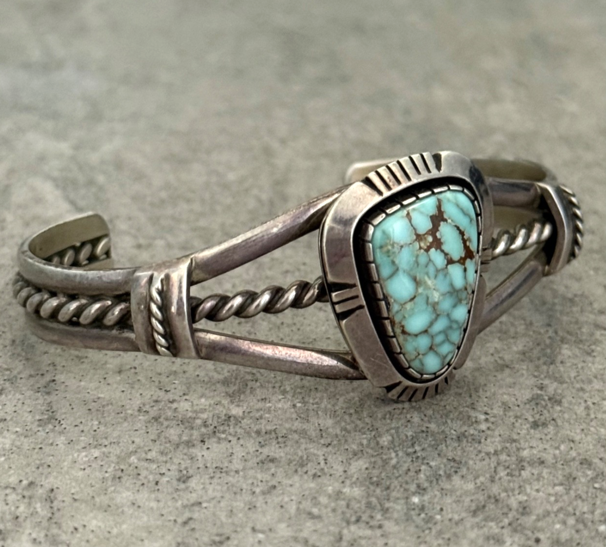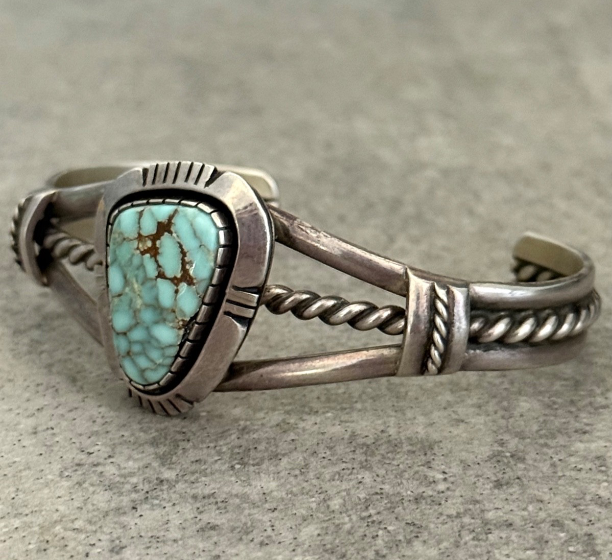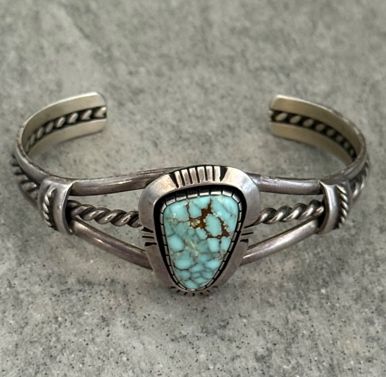 This is an eye-catching Navajo sterling silver bracelet. This stunning bracelet contains Natural HIGH GRADE DRY CREEK turquoise stone. Stone is surrounded with hand carved silver border work. Sturdy triple shank bracelet contains twisted rope center. Bracelet is embellished with silver bars. *Dry Creek Turquoise comes from a small turquoise mine outside of Austin,Nevada in Lander county.This mine is previously known for its sky blue to medium blue webbed turquoise.Dry Creek Turquoise has gained much popularity over the years with its creamy pale blue and golden to cocoa brown matrix.Only high grade Dry Creek Turquoise has beautiful light brown, golden yellow or orange webbed matrix. This mine is currently closed due to family disputes. *EACH PIECE OF MY COLLECTION IS CLEANSED WITH WHITE SAGE. The inside measurement from tip to tip is approximately 5-1/2" and the opening measurement between the tip is approximately1-3/8" Approximate width of the bracelet is 2-5/8"(across inside). Approximate size of the stone is 3/4"L(North to South) ,1/2" W(East to West) (measured from center of the stone).NO cracks in the stone. Sturdy 34.3 grams in my scale. ADJUSTABLE & STACKABLE Bracelet!!! This bracelet would be a great addition to any Native American or Southwestern jewelry collection.Also this amazing bracelet is a timeless beauty with lots of good energy! SMOKE AND PET FREE ENVIRONMENT. If you have any question please contact me via eBay messages and PLEASE CHECK MY OTHER LISTINGS AS WELL! THANK YOU FOR STOPPING BY!