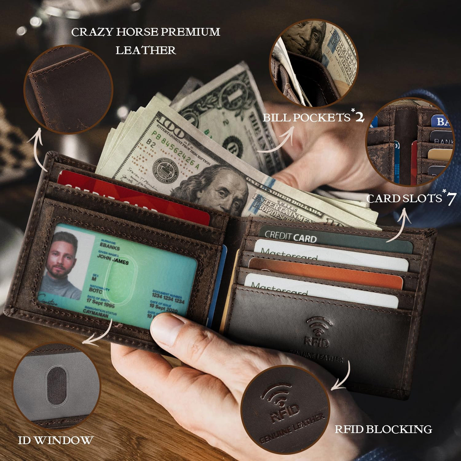 100% Genuine Top Grain Leather, Unique Vintage Feel: Made from 100% Crazy Horse top grain leather, treated with vegetable tanning and natural oils, creating a unique distressed look. Over time, the leather softens and gains a personalized character. Built to Last, Gains Charm with Time: As you use it, the leather naturally changes in color and texture, giving each wallet a one-of-a-kind appearance. The leather becomes more durable, gaining value the longer you use it. RFID Protection, Safeguard Your Privacy: Equipped with built-in RFID-blocking technology to protect your personal information, keeping your credit cards, IDs, and other sensitive data safe from electronic theft. Timeless Design, Versatile & Stylish: Sleek, minimalist design suitable for any occasion, exuding understated sophistication. Perfect for both everyday use and formal events. Practical & Compact: Smart design with organized compartments for cards, cash, and more. Slim and easy to carry anywhere. Luxury Gift Box, Perfect for Gifting: Comes in a beautiful gift box, making it the perfect gift for friends, family, or colleagues to express thoughtfulness and style.