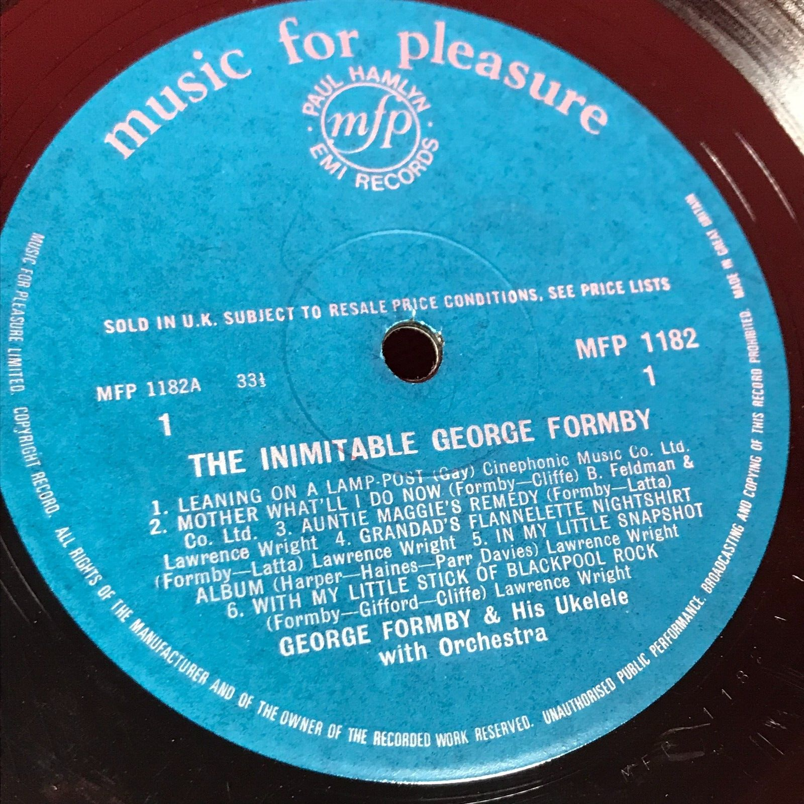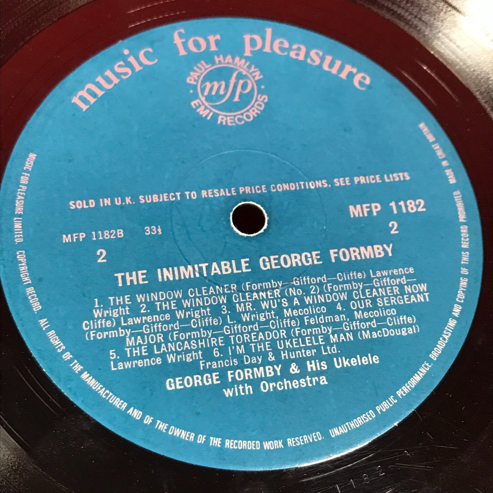 GEORGE FORMBY I'm The Ukelele Man - 1966 UK mono vinyl LP, including Leaning On A Lamp-post, The Window Cleaner & the banned-by-the-BBC With My Little Stick Of Blackpool Rock. MFP1182 Leaning On A Lamp-post Mother, What Will I Do Now? Auntie Maggie's Remedy Grandad's Flannelette Nightshirt In My Little Snapshot Album With My Little Stick Of Blackpool Rock The Window Cleaner The Window Cleaner (No2) Mr Wu's A Window Cleaner Now Our Sergeant Major The Lancashire Toreador I'm The Ukulele Man Record Condition : Excellent Sleeve : Minor shelfwear (see photo) Please check out our other items
