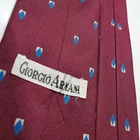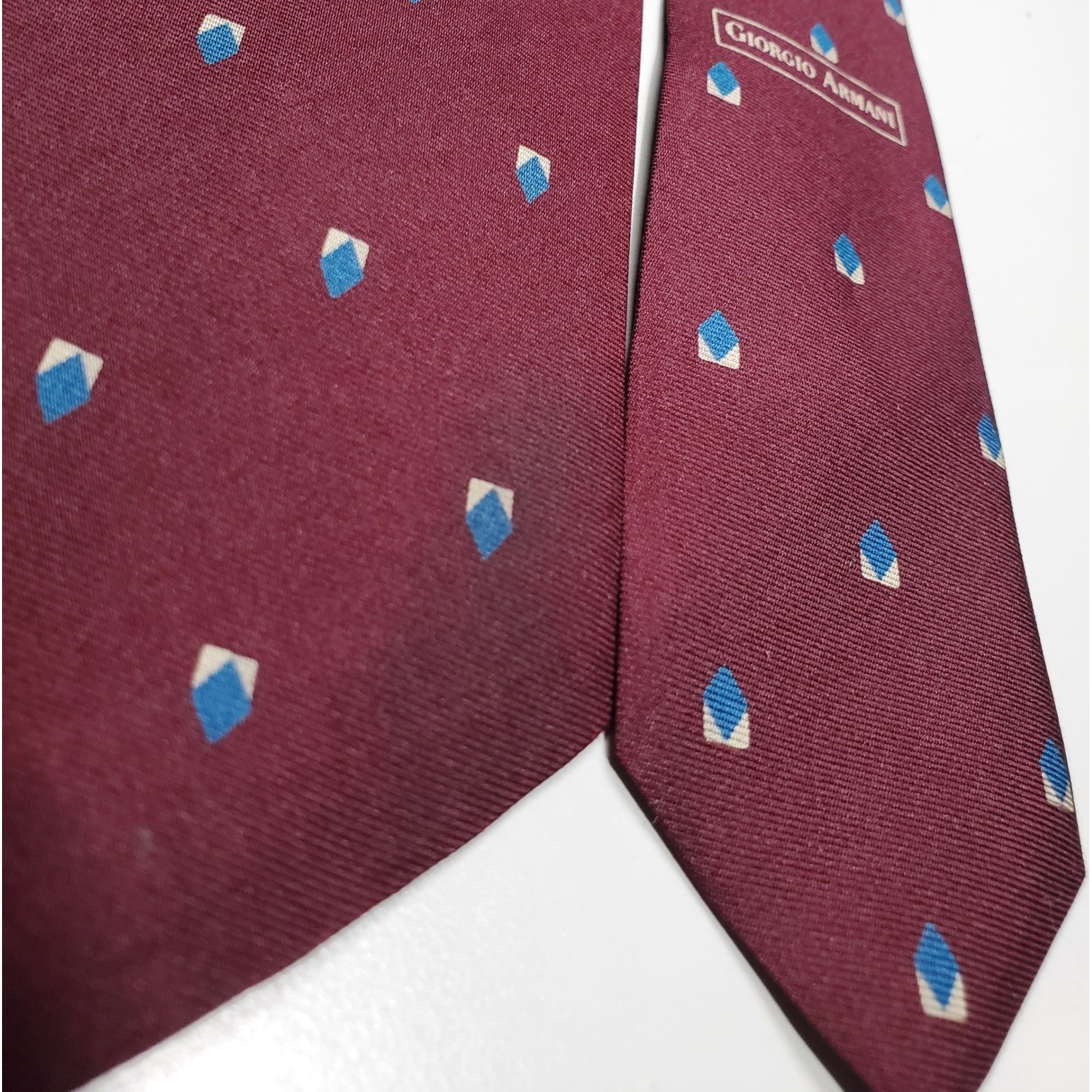 Giorgio Armani silk tie crafted in Italy, featuring a sophisticated geometric diamond pattern in blue and white against a rich burgundy background. Flaw in last picture. This classic necktie offers a refined aesthetic suitable for professional or formal occasions, constructed with a high-quality ribbed silk texture that provides a substantial feel and elegant drape. The understated repeat pattern adds a touch of modern flair to a traditional wardrobe staple.
