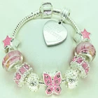 PERSONALISED ENGRAVED CHARM BRACELET Personalised with an engraved heart with ANY MESSAGE *FREEPOST* Snap clasp bracelet Presented in a beautiful satin lined gift box Gorgeous pink sparkle bracelet Loaded with 9 quality charms with sparkling rhinestones in gorgeous shades of pink with a dainty pink enamel butterfly. *Topped off with a high quality stainless steel heart charm personally engraved with ANY MESSAGE* Comes complete with a FREE stopper to keep your beads secure Please select your size & message option from the drop down menus *IMPORTANT* **The heart charm can be engraved with approx 30 characters (including spaces) I have put some suggestions in the drop down menu to help you or you can message via ebay messages with your own personal choice of words. Please note your message will be engraved exactly as you have typed it including upper/lower case letters** Available in sizes 15-21cms (Larger sizes available upon request) Silver plated (Heart pendant stainless steel) To ensure you order the correct size bracelet please measure your wrist then add on approx 2~4cms to allow for the beads UK Seller ~ Fast Dispatch Can also be customised with your own beads & charms, will fit most popular BRANDED beads & charms with a hole size of approx 4.5mm As a rough guide 16cm~4-6 year old, 17cm 6-8 year old, 18/19cm 8~Teenager, 20cm and upwards suitable for adults ~ Listing is for ONE complete bracelet only As these bracelets contain small parts please ensure children are closely supervised ~ Please note we reserve the right to substitute bead/beads for a similar alternative depending on stock levels. All photos are taken by myself and are photographed on an 16/17cm chain -please remember your bracelet comes with 9 charms regardless of the size of chain you order-if you require a larger size chain you may wish to purchase extra charms to fill up your bracelet. Your bracelet will be personally engraved to your specification, therefore regretfully we are unable to offer refunds on personalised engraved items. If you find it is not a perfect fit we are always happy to exchange for an alternative size. Please note the longer your message the smaller the font will be on your charm.