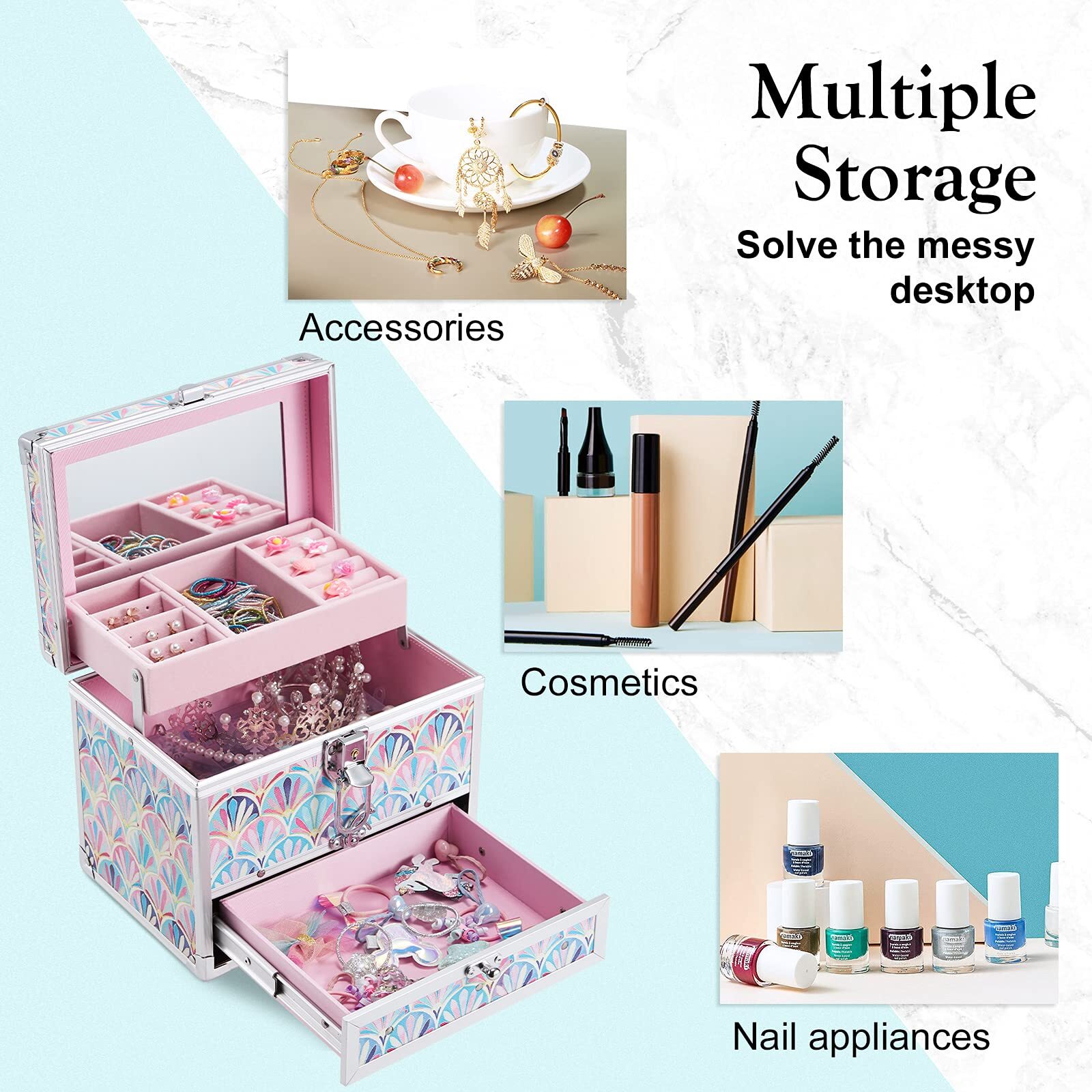 ※ Adorable Jewelry Storage Box - This beautiful jewelry box organizer is outstanding for its metal structure and unique design. It's larger than an ordinary jewelry box so it holds all kinds of accessories other than a kid's jewelry collections. The drawer and tray allow flexible storage for all her trinkets. ※ Create Unique Memories - It is actually with fun to organize her pieces of jewelry, bracelets, hairpins or band and other small gadgets into this impressive jewelry and accessory case as her "secret treasure trunk", which is fully lined with pinky interior and attach with a mirror on the lid. ※ Inspiring Design - The exclusively designed mermaid theme pattern has all the adorable elements and rich colors will easily set off one's imagination into fun and joy. The vividly colored jewelry box for the girl would also match with her room's décor. ※ Trusted Quality - Unlike the wooden jewelry box, Our company's box has no small parts and is equipped with round corners all made with premium metal. As a metal-framed box, it has very long durability and will always accompany her as she growing up. ※ Ideal Birthday Gift for Girls - For age 5 to age 8 or even a teenage girl, this beautiful and useful jewelry box case will surely win a sweet smile on her face, choose as a birthday gift and enjoy the surprise moment.