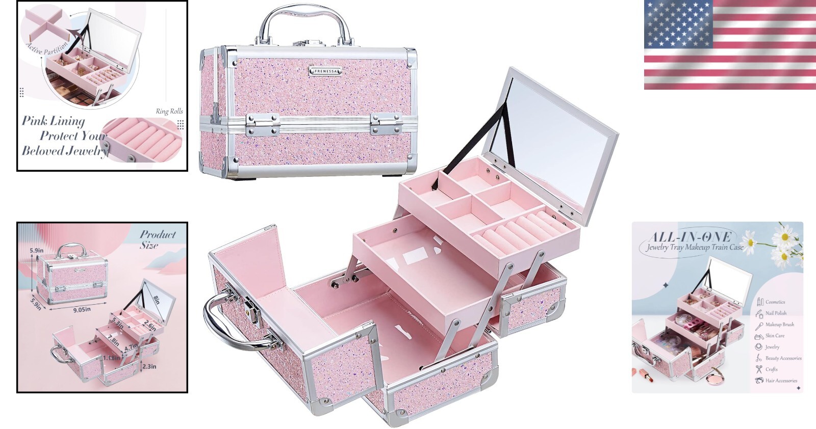 Girls' Shiny Pink Makeup Organizer - Portable, Lockable with Mirror & Trays ‹ › ‹ › ‹ › ‹ › ‹ › ‹ › ‹ › ‹ › ‹ › ‹ › Girls' Shiny Pink Makeup Organizer Elevate the beauty experience for your little princess with our chic and portable Shiny Pink Makeup Organizer. Perfectly sized at 9 inches x 6 inches x 6 inches , this elegant train case is not just a makeup box; it’s a treasure chest for her imagination, ideal for slumber parties or hosting a delightful play spa day. Key Features: Durable Design: Made from high-quality ABS with aluminum accents and reinforced metal corners for enduring style and lightweight functionality. Organized Storage: Multi-functional layout with four compartments for earrings, a dedicated ring case, and two tiered, stain-proof trays for all her makeup essentials. Convenient Mirror: Features an extendable cantilever design with a built-in mirror, allowing her to view all her favorite items at a glance while getting ready. Lockable and Portable: Designed with a generous, non-slip handle, this makeup organizer is easy to carry. The lockable mechanism with key ensures her cosmetics are protected and secure. Travel Ready: Compact and easy to store, making it the perfect companion for refreshing her look anytime, anywhere. Why Choose Our Makeup Organizer? This Shiny Pink Makeup Organizer is more than just a case; it embodies creativity, organization, and style. The combination of portability and durability means your little girl can take her essentials wherever she goes, while the thoughtful compartments keep her treasures tidy. The lockable feature adds an important level of security for her beloved collection, giving peace of mind for parents and empowering independence for her. The Perfect Gift: This elegant makeup case makes for a delightful gift for birthday parties, summer holidays, sleepovers, or makeovers! It’s perfect as a party favor, stocking stuffer, or back-to-school surprise. Encourage a passion for beauty and creativity with this stunning organizer! Order the Girls' Shiny Pink Makeup Organizer today and let her beauty shine wherever she goes! Shipping Free & Fast Shipping - We offer free shipping to most of the USA with a normal delivery time of 3-7 days. However, due to the current situation, additional delivery time (up to 3 weeks) may be required for some items. Alternative Carriers - We may use alternative carriers (e.g. USPS, FedEx, UPS, etc.) to ensure your package arrives safely and on time. Due to the use of multiple carriers, we are unable to provide a tracking number automatically. Handling Time - Orders are processed and shipped within 1-2 business days of receiving cleared payment. Shipping Restrictions - Shipping to Alaska, Hawaii, Puerto Rico, Guam, and other US territories may incur shipping charges or delivery restrictions. Please contact us before ordering, or your order can be refunded/cancelled. State Restrictions - There may be restrictions based on your state of purchase. For example, certain items may not be shipped to California due to state regulations. Contact for Tracking Updates - If you require tracking updates or have any concerns about the delivery of your order, please feel free to contact us, and we will be happy to assist you. Return 30-Day Hassle-Free Returns - We want you to be completely satisfied with your purchase. If you are not, you can return the item within 30 days of receiving it for a full refund or exchange. Easy Return Process - To start a return, simply contact us and we will provide you with a prepaid return shipping label and detailed instructions. Restocking Fee - There are no restocking fees for returns. However, the buyer is responsible for return shipping costs if the return is not due to a seller's error. Refund Processing Time - Refunds will be processed within 5 business days of receiving the returned item in its condition. Payment We accept all major credit cards, PayPal, and Apple Pay for your convenience. Your payment information is secure and encrypted to ensure a safe and seamless transaction. Please complete your payment within 3 days of purchase to avoid any delays in shipping. Feedback Your feedback is extremely important to us. We strive to provide the best products and customer service possible. If you are satisfied with your purchase, please take a moment to leave us a positive review. If you have any concerns or issues with your order, please contact us before leaving negative feedback. We are committed to resolving any problems and ensuring your satisfaction. Contact Us If you have any questions or concerns, please feel free to out to our customer support team. You can contact us through the eBay messaging system. We are available Monday to Friday, 9:00 am to 5:00 pm EST, and we will do our best to respond to your inquiry within 24 hours. Buy it now and enjoy a pleasant shopping experience! Model: Makeup Case Organizer Unit Quantity: 2.2 Material: Aluminum,Metal,Plastic,ABS Features: Heavy-Duty,Mirror,Tiered,Portable,Lockable Type: Makeup Case Color: Pink Item Weight: 2.2 lb Unit Type: lb