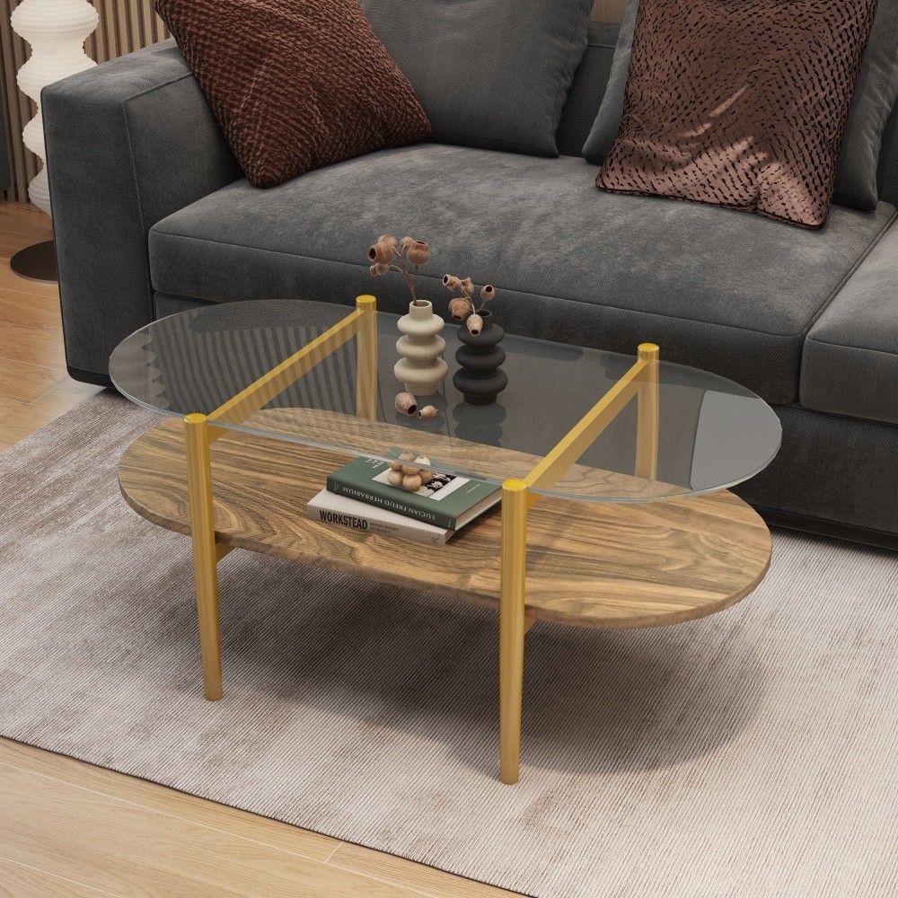 Modern Double-Layer Oval Tempered Glass Coffee Table - Transparent Glass & Coffee Brown MDF, Open Storage for Living Room Elevate your primary living space with this sleek modern oval coffee table, a perfect fusion of contemporary design and practical functionality. Crafted with a tempered glass tabletop, coffee brown MDF lower shelf, and sturdy matte alloy legs, it balances transparent elegance with warm wood tones—seamlessly blending into diverse home styles while delivering reliable daily use. Key Features Premium Tempered Glass Top : The transparent tempered glass tabletop boasts exceptional clarity, strength, and scratch resistance, adding a sleek, airy vibe to your living room. It’s easy to clean—simply wipe with a soft dry cloth to maintain its pristine look, ideal for busy households. Double-Layer Open Storage : Designed with a spacious oval top and a coffee brown MDF lower shelf, this dual-tier table maximizes open storage and display space. The top holds drinks, snacks, decorative items, or daily essentials; the lower shelf stows books, magazines, baskets, or accent pieces, keeping your living area tidy and visually appealing. Safe & Stylish Design : Rounded edges on the glass top prioritize safety, minimizing collision injuries for kids and pets. Tapered matte alloy legs enhance the modern aesthetic while providing robust stability—even when fully loaded—blending style with peace of mind. Durable Construction : A winning combination of tempered glass (clear, shatter-resistant), coffee brown MDF (stable, uniform density, eco-friendly), and matte alloy legs (sturdy, corrosion-resistant) ensures long-lasting durability. This coffee table is built to withstand everyday wear and tear for years of use. Easy Assembly & Maintenance : Clear, step-by-step instructions are included, allowing most users to assemble the table in 15-30 minutes—no professional tools needed. Maintenance is effortless; just wipe surfaces with a soft dry cloth to keep it looking brand new. Versatile Style Matching : This coffee table seamlessly pairs with sofas and furniture of various styles, from modern minimalist to traditional classical. It’s the perfect accent piece for your primary living space, adding a touch of sophistication without overwhelming your existing decor. Secure Packaging & Shipping : Tightly packaged with protective materials and delivered via professional logistics, ensuring the table arrives safely at your doorstep—free from damage during transportation. Color Variation Notice : All product colors on our website are for reference only. Due to differences in screen device color settings, lighting, and shooting angles, slight color variations between the actual product and images may occur. This is a normal phenomenon and not a quality defect. Specifications Attribute Details Assembled Dimensions 40.83" L x 18.31" W x 17.24" H Assembled Weight Not Applicable Packaging Dimensions 46.85" L x 24.41" W x 8.20" H Packaging Weight 49.82 lbs Material Tempered Glass Top + Coffee Brown MDF Lower Shelf + Matte Alloy Legs Color Transparent Glass + Coffee Brown (MDF) + Matte Alloy (Legs) Storage Type Open Storage (Double-Layer) Applicable Scene Primary Living Space (Living Room) Why Choose This Coffee Table? This modern oval coffee table combines style, safety, and functionality—making it a must-have for any living room. The tempered glass top adds a contemporary flair, while the MDF lower shelf brings warmth and storage. Its versatile design fits diverse decor styles, and the durable construction ensures it’s a long-lasting addition to your home. Warranty & Return Policy Shop with complete confidence! This coffee table comes with a 1-Year Manufacturer’s Warranty , covering defects in materials and craftsmanship. We also offer a 30-Day Free Return & Exchange Policy —if you’re not fully satisfied with your purchase, you can return or exchange it within 30 days of delivery (terms and conditions apply). Upgrade your living room with this elegant and practical double-layer glass coffee table—order today and transform your space!