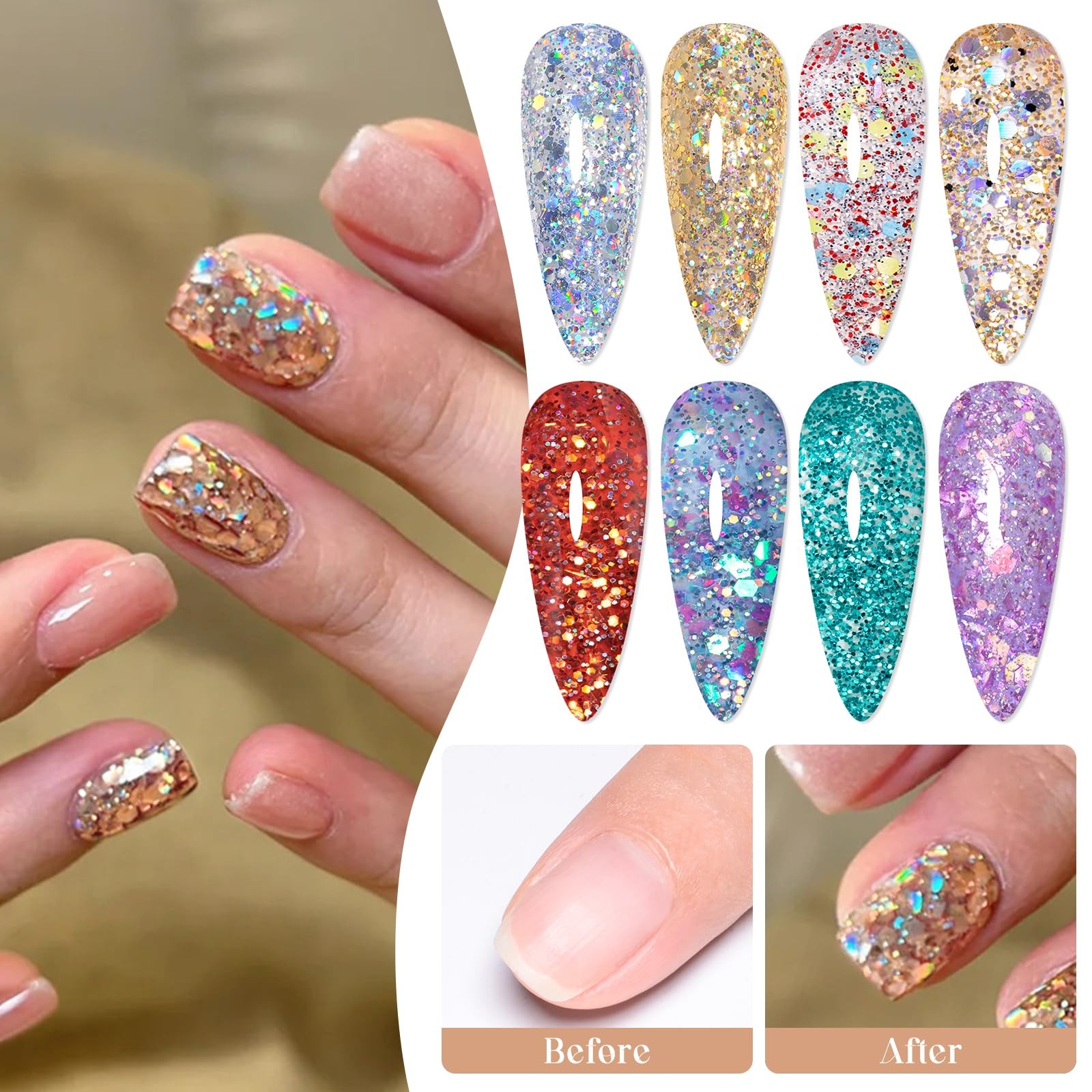 Package Include: 8 Bottles 7ml reflective gel polish.In flash they are reflective and out of flash depending on the lights looks so cool, extra personality in the sun and light!Two charming effect natural light normal effect and flashing disco Effect.Not only suitable for daily life but also for parties attractive and different effects will surprise you. Easy Application And Good Tenacity: The series of reflective gel nail polish set is long lasting for 21+ days with perfect shine under proper application - With base gel top coat under the full application process.High durability and intense pigmentation makes it stay last longer and brings you brilliant shine finish. Rich Colors: whether it is sequin gel nail polish or fragment gel polish, there are a variety of colors to choose from, including various solid colors and multi-color blends, which can meet the needs of different consumers for color and achieve diversified nail design. Delicate Texture: The high-quality sequin nail gel and fragment nail gel are delicate in texture, smooth and even when applied, without lumping, sticking or obvious brush marks, and can be well attached to the nail surface, showing a delicate effect. Ideal Gift: Gel nail polish kit are appropriate for any holiday or special event,such as birthday, holiday, anniversary, Christmas, Valentine's Day, Halloween gift. Solid nail designs can be freely finished with these classic color gel.