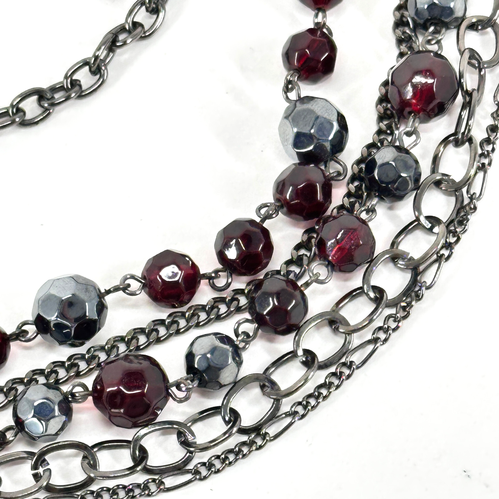 Necklace Glossy 5 Strand Black Mixed Link Chain with Round Red and Black Faceted Glass Beads Vintage Very Good Condition. Smooth beads are actually very red under the light. Nice effect. Very unusual piece. See Photos. Thank you for your interest in this item. We will happily combine shipping. Please visit our store at: ebay.ca/str/couldntbebettercollectibles – Canadian ebay.com/str/couldntbebettercollectibles – U.S. WE SHIP WORLDWIDE If you encounter any difficulties with your purchase please contact us. We will provide accurate shipping rates and ensure delivery. Like and Follow Us for updates on new finds. Tell us the things you like to collect. Your Feedback is important. Please take a moment to let us know how we did. Happy Shopping.