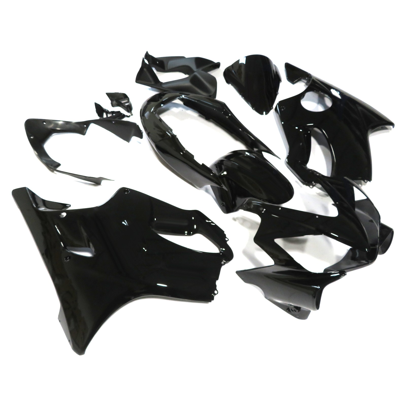 Fitment: For Honda CBR600F4i 2004-2007 Specification: Condition:100% Brand New, Aftermarket Fairing, Non OEM Material: Made of High quality and durable ABS plastic , good elasticity and heat tolerance. Heat-shield technology adopted. Color: Glossy Black (as pictures show) Sureface Finish: UV Painted , high quality paint job with 3 layers of clearcoat. Molding: ABS Injection Molded Pre-Drilled holes for quick installation The fairing bolts and installation instruction are not included Professional installation is highly recommended. Painted Technology: Advanced UV Light Solidfication Technique for painting ; Compare with the ordinary painting , it is much higher in color saturation and lustrousness. After UV Process , it becomes much stronger in abrasive resistance and chemical resistance. Package Including: 1x Bodywork Fairing Kit (10 Pieces) 1x Heat Shield 1x Windscreen