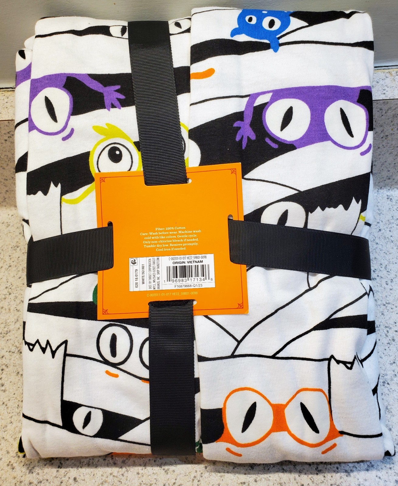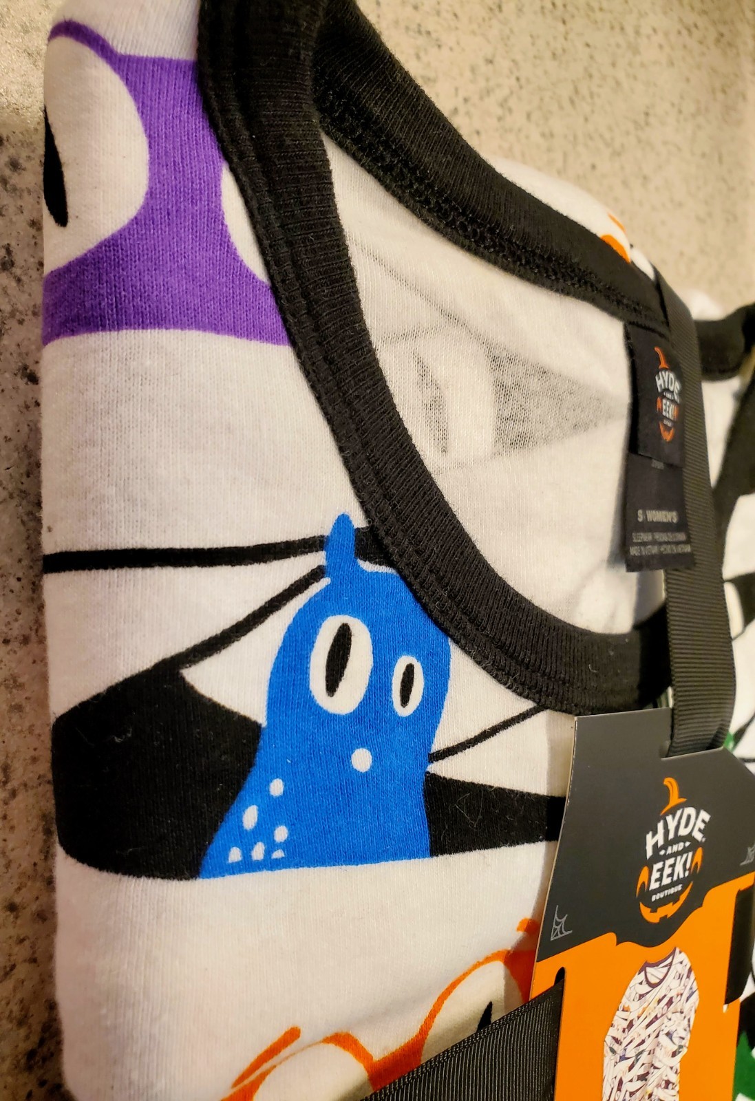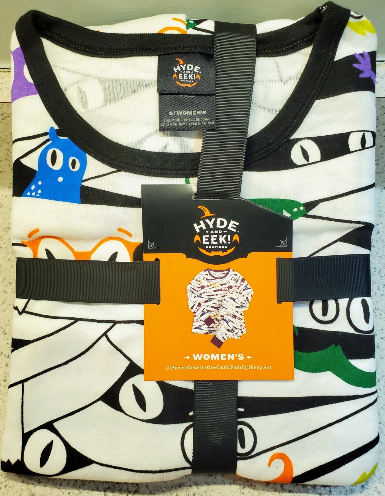 The NEW HYDE AND EEK! Glow in the Dark 2 pc Halloween Mummy PJ's in size Women's XS is a fun and festive pajama set perfect for women. Made from 100% cotton knit fabric, this pullover set features a graphic mummy design with a crew neck and long sleeves. The white and black color scheme and glow-in-the-dark features add to the Halloween theme, making it an ideal choice for the fall season. Easy to care for with machine washable instructions, this pajama set is sure to provide a comfortable and stylish sleepwear option for anyone. Part of the Family matching sleep sets