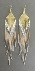 1 pair of gold, white, grey and bronze long seed bead beaded earrings. You will receive earrings pictured. The earrings are handmade with seed beads. The earrings are approximately 6 1/4" long with the ear hooks included. The ear hooks are sterling silver, gold plated. They are for pierced ears. 0-ea-seed-102-1