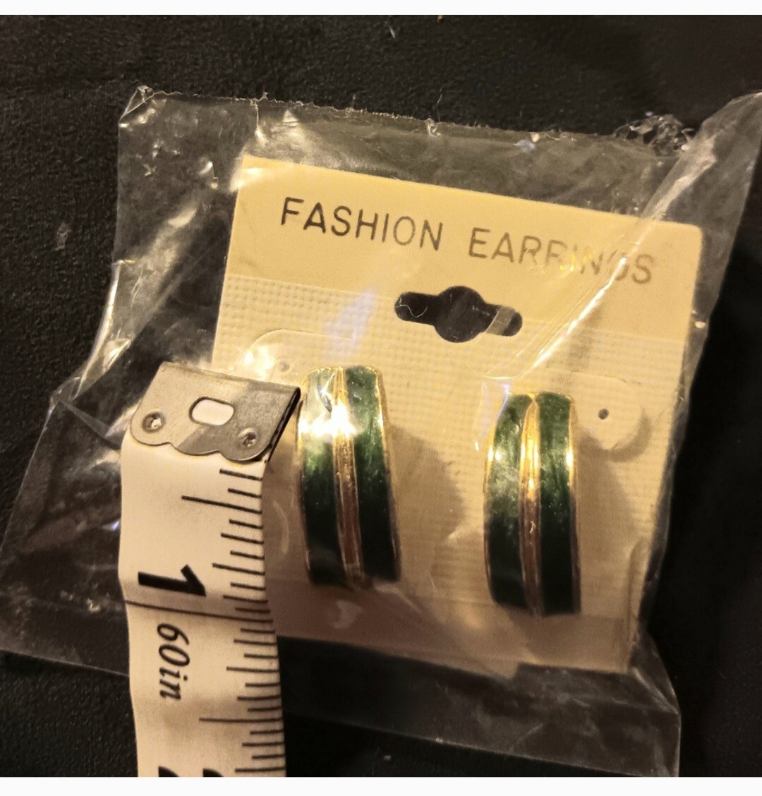 Fashion enamel earrings. Gold and green hoops. 1 inch long and about 1/2 inch wide. Regular post back. Not super heavy. Easy to wear all day.