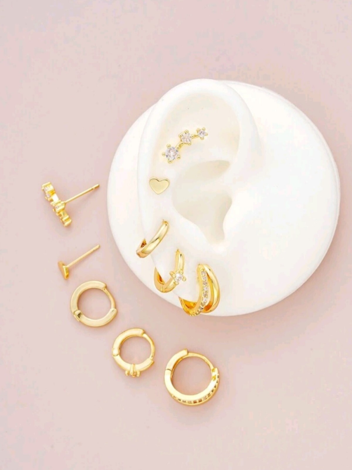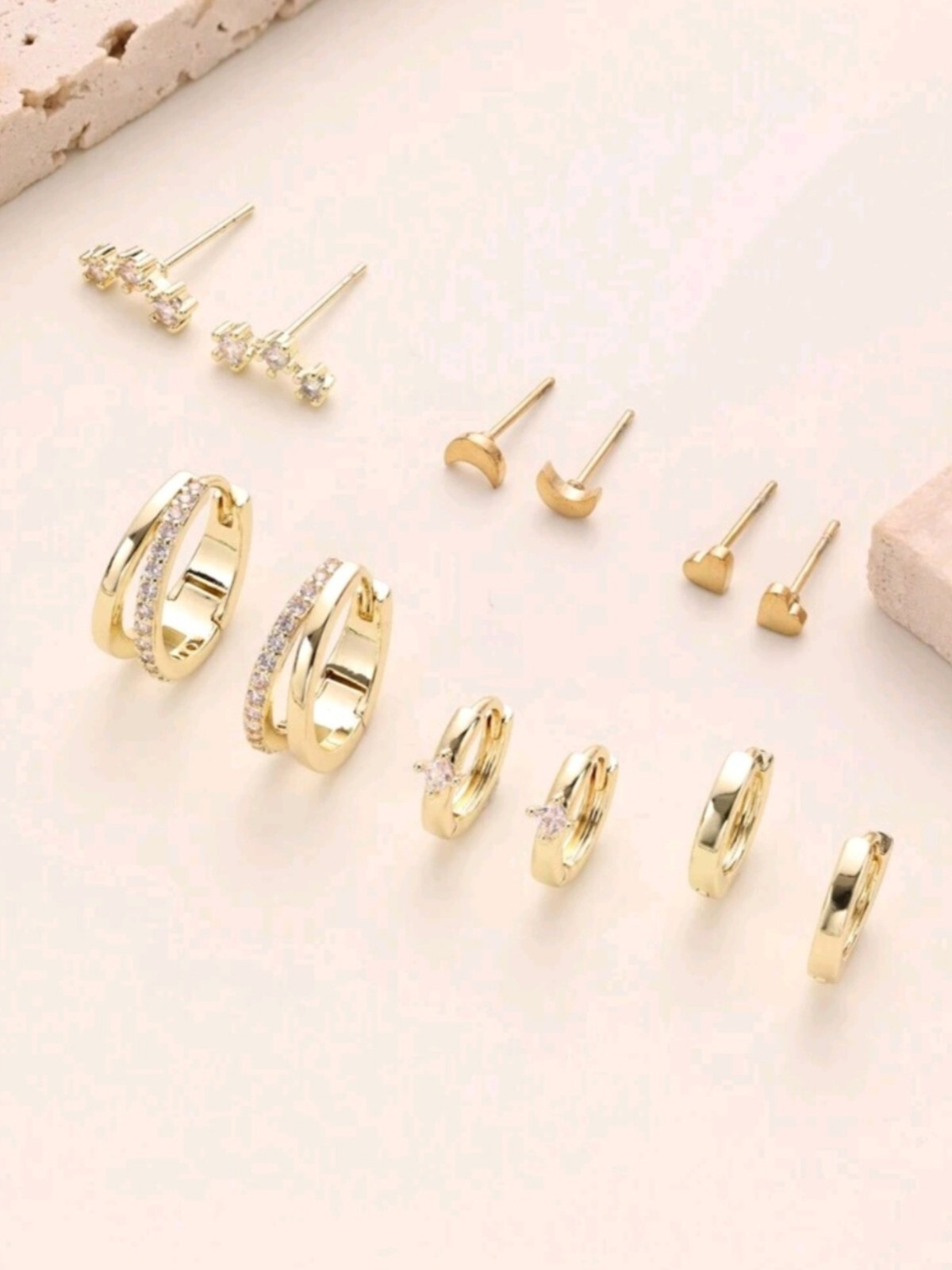 Unlock a treasure trove of versatility with this 6-pair earring set, designed to add effortless elegance to any look. Crafted with precision and 18K gold plating, this set is a playground for the adventurous spirit of women who love to mix and match. Why You’ll Adore Them: ✨ Golden Hugs for Your Ears: Featuring trendy huggie hoop earrings that embrace your lobes with timeless charm. ✨ Double the Drama: Bold double hoop earrings to amplify your style and spark conversations. ✨ A Touch of Magic: Delicate moon and butterfly stud earrings that whisper celestial stories of beauty. ✨ Cubic Zirconia Brilliance: Shimmering stones that rival starlight, adding the perfect dose of sparkle. Perfect for multiple piercings, these earrings are a dream come true for curating your ear stack. Wear them solo for a minimalist vibe or layer them up to make a bold statement. Whether you’re dressing for work, a casual outing, or a romantic evening, this set has you covered. Gift the Glow: Ideal for birthdays, anniversaries, or just because – give the gift of endless style options! Add this 6-pair earring set to your collection and let your inner stylist shine. Each pair isn’t just jewelry—it’s a golden opportunity to express YOU.